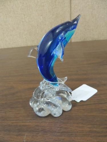 7"H BLUE & CLEAR GLASS STYLIZED LEAPING DOLPHIN FIGURE. AS SHOWN. VIEW PICTURE FOR DETAIL.