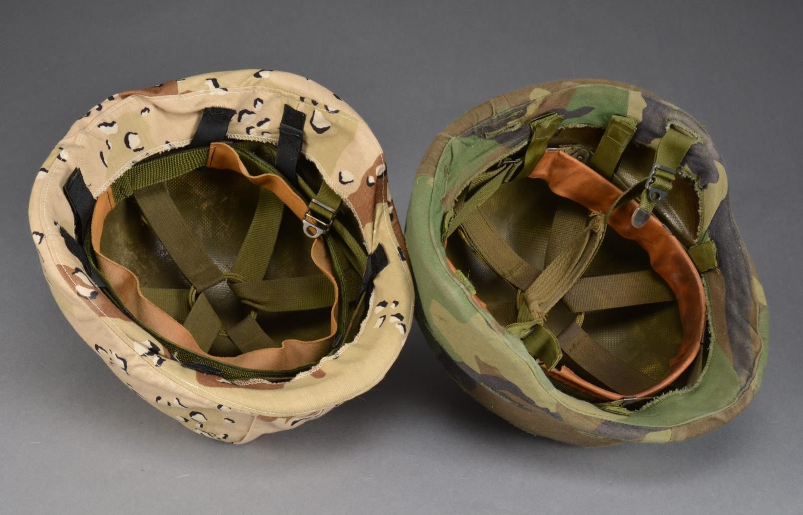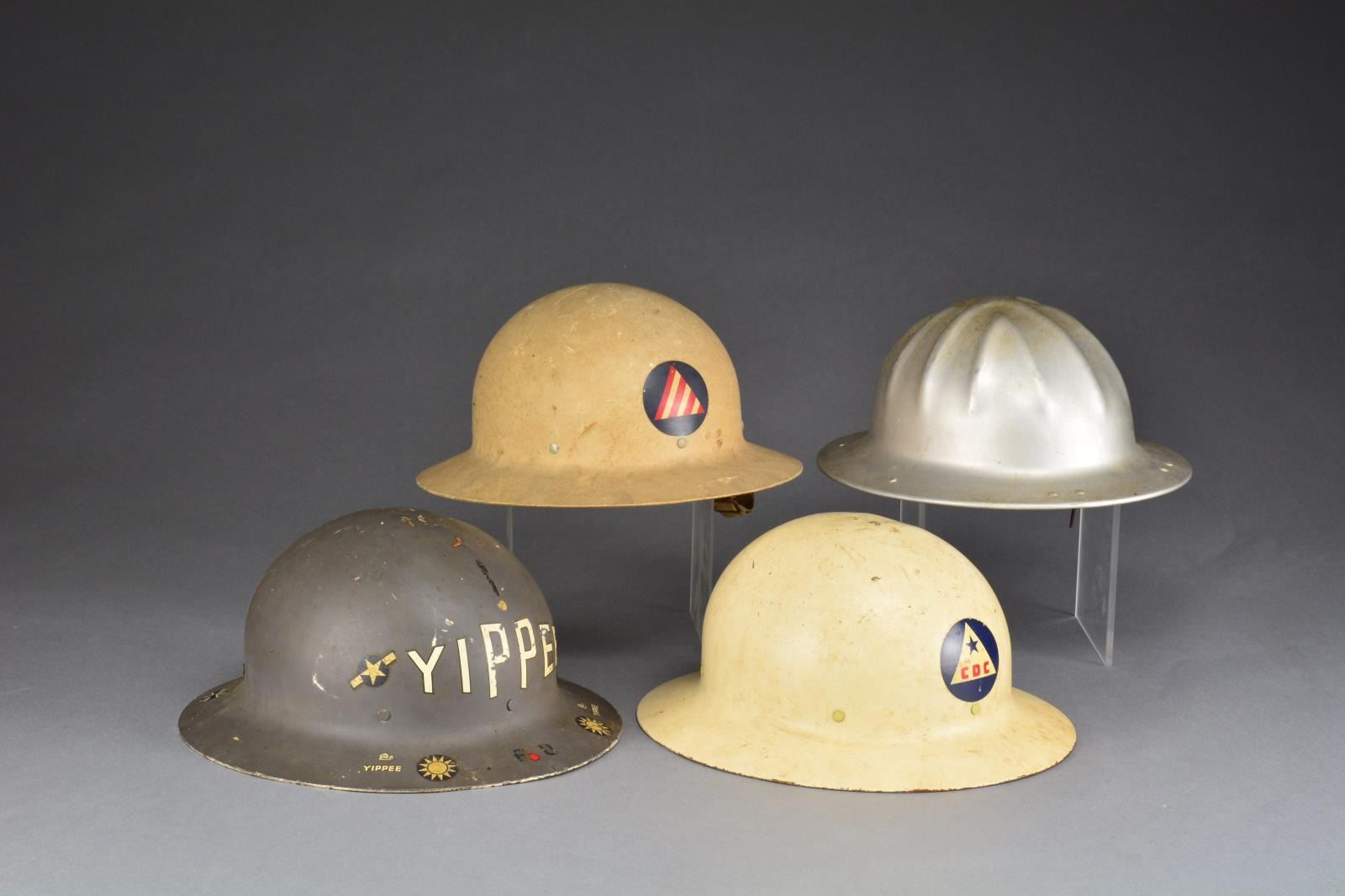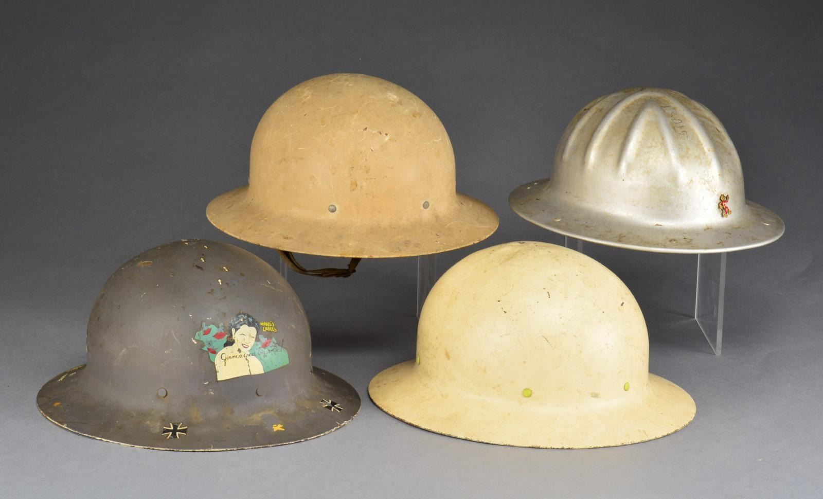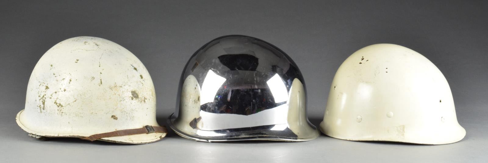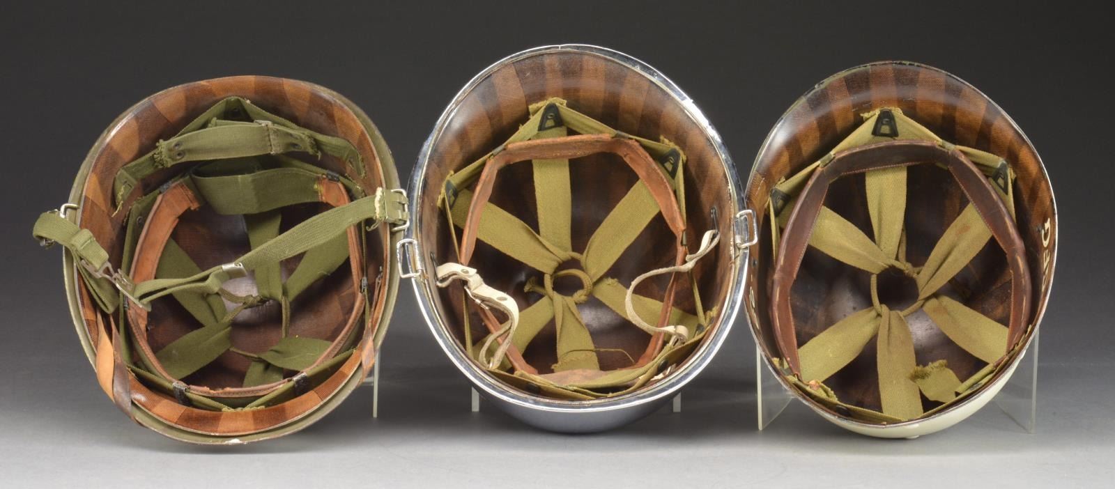 1) Standard WWII era Civil Defense helmet overpainted gray w/ Maltese cross decals & China star decals on the upper rim. Front is decorated w/ a mid-shoulder up view of a woman w/ the title, “Gimme a great big smile!” & “MABEL’S LABELS”. Back is decorated w/ 2 Air Force stars & the word “YIPPEE”. 2 & 3) Standard white WWII era Civil Defense helmet w/ liner & chinstrap. 4) Unfinished aluminum construction hard hat marked “B.F. McDONALD CO – LOS ANGELES –“. CONDITION: all helmets show light to moderate wear. (02-13971/BF). 5) Chrome plated, front seam, swivel bail helmet w/ white painted liner stamped w/ the owner’s name & “P-7519”. White leather chinstrap. Liner is of standard WWII form w/ center front vent. 6) White painted, rear seam, swivel bail helmet. Many helmets of this form were painted in late WWII or during the Korean War. White helmets were often used for snow camouflage & occasionally for guard units. 7) White painted, WWII era liner. Liner has a tricolor crest on the outer left side. Interior is painted “1ST-GFG” on the left & “99” on the right. The liner was worn by the First Company Governor's Foot Guard of Connecticut likely as ceremonial or guard headwear. CONDITION: chromed helmet has a mirror finish & liner shows moderate wear. White helmet has 95% painted finish intact & liner shows light wear. White GFG liner shows light wear overall. (02-13972/BF). 8 & 9) 2 Late 20th or early 21st century US military helmets. 1 Has a forest camo color, the other a desert camo color. Both have complete nylon liners & chinstraps. CONDITION: very lightly used. (02-13973/BF). $350-700.