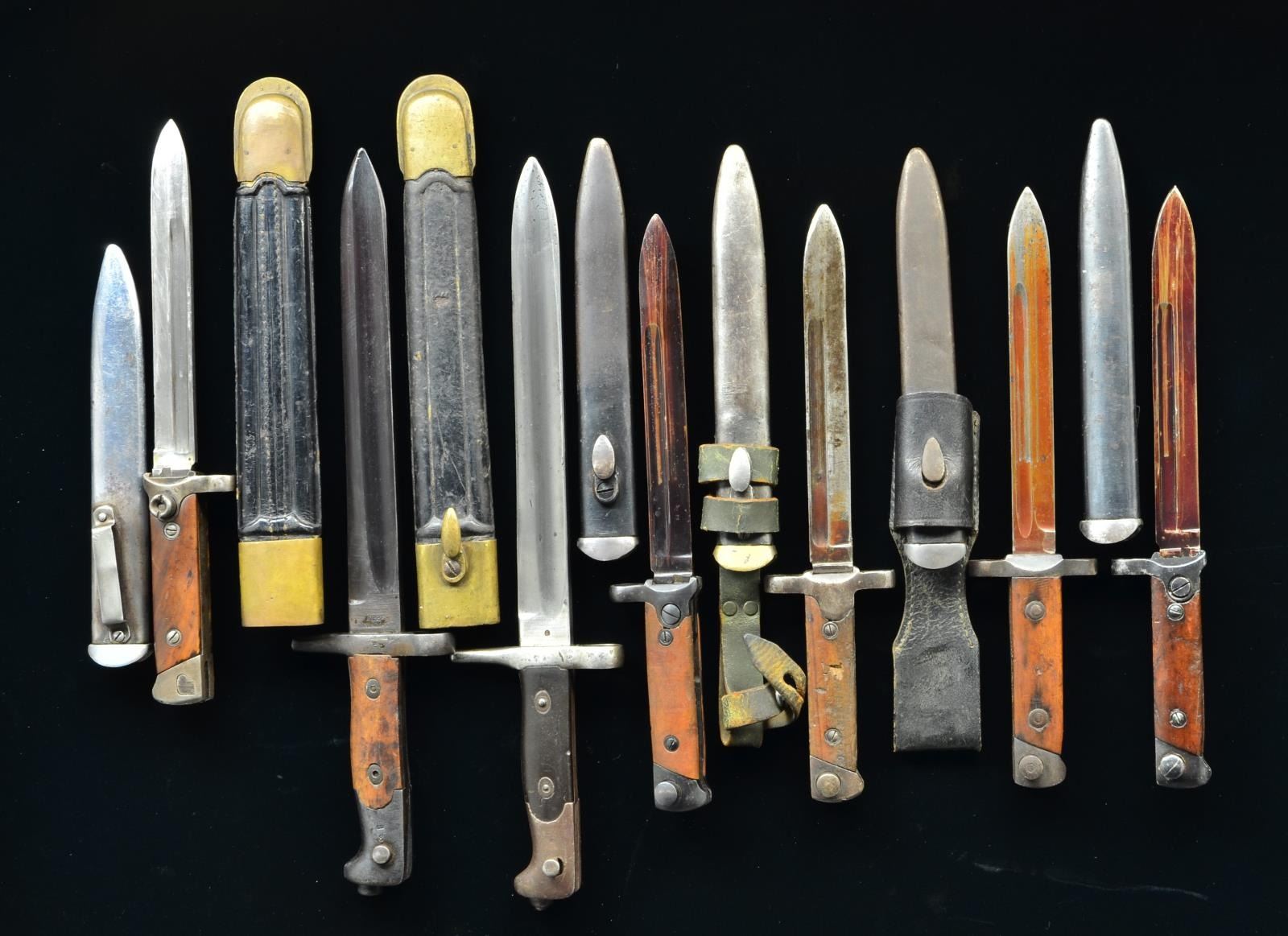 2) TORRE ANNUNZIATA 1870/87/16 BAYONET WITH MATCHING NUMBERED SCABBARD. Overall length: 15.5". Blade shortened to 9.25". Tip of scabbard & crossguard numbered "LM9465. Wood grips. Shortened button spring. Leather scabbard w/ brass tip & throat. CONDITION: Good arsenal refinished bayonet w/ prior pitting, wear & patina. Good scabbard w/ patina & scuffs.