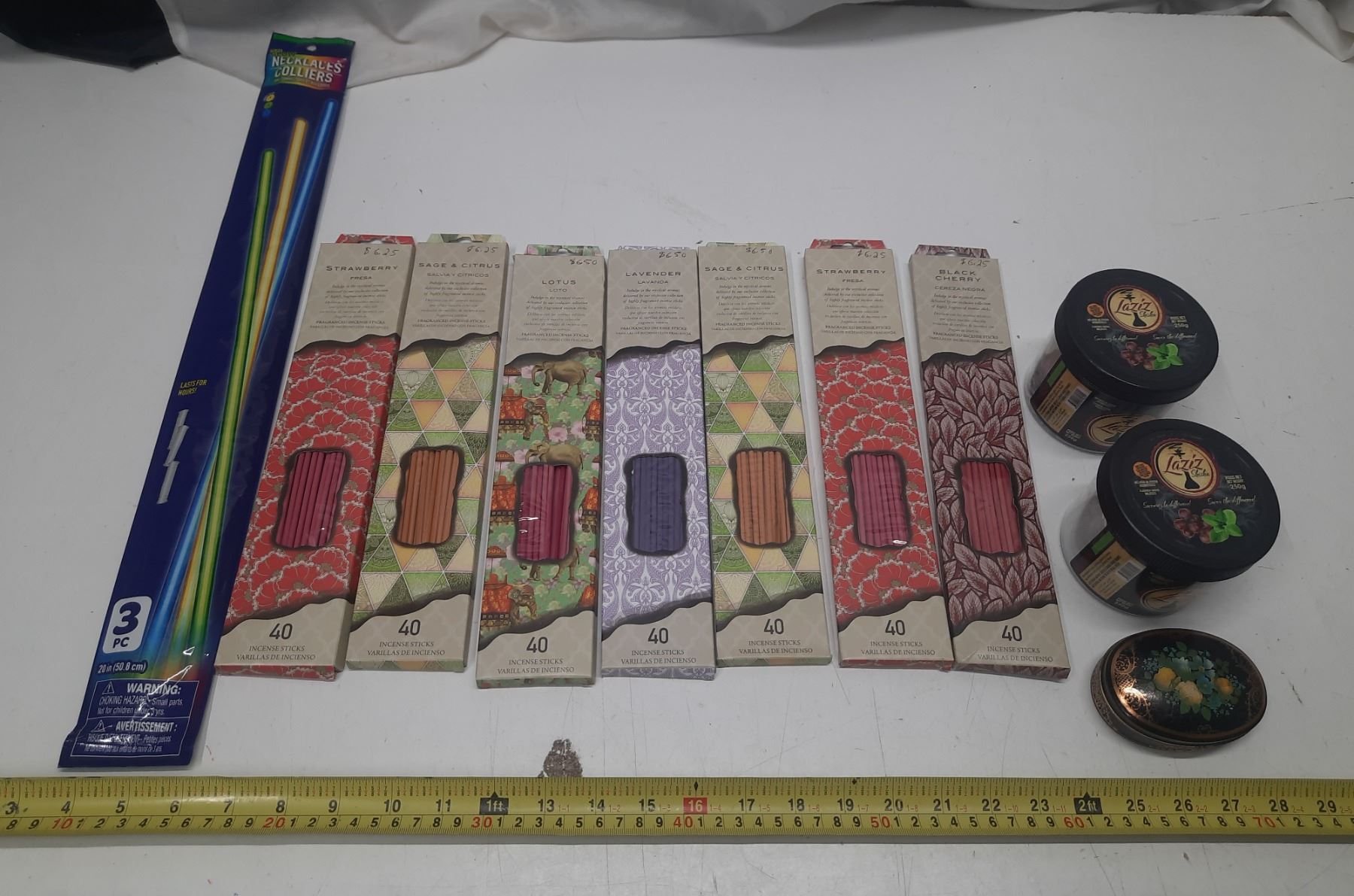 (7) Incense Sticks, Play Glow Necklaces Colliers, (2) Laziz Shisha and Candle, etc.