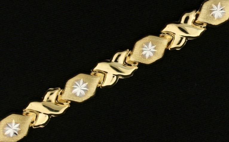 In 10k yellow and white gold. 7mm wide with lobster clasp. 4.3g.