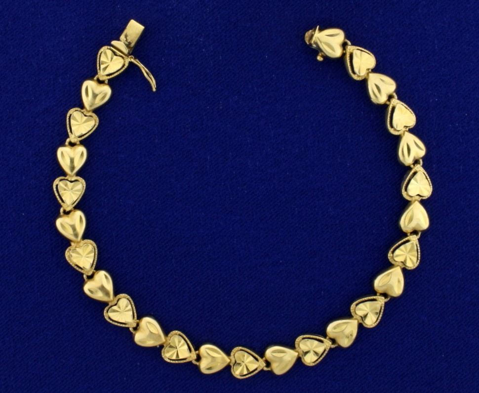 In 14k yellow gold, 7" long and 6.5mm wide with safety clasp. 8.7g.