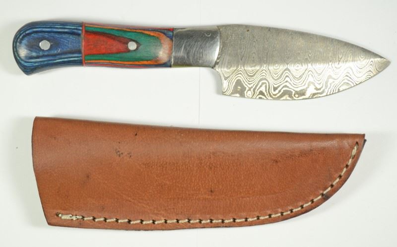 7 Inch Rare Rain Drop Patter Genuine Top Grade Damascus Steel Hunting Knife/Skinner with an Exotic Colored Wood handle. 3.5" blade, 3.5" handle. Genuine Leather Sheath. (Designed as a ladies knife) EST:$150-$200