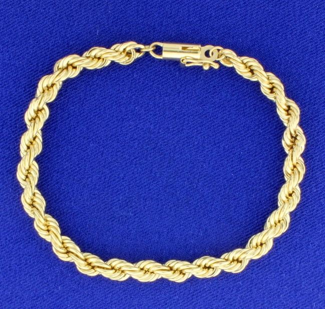 The bracelet is 14K yellow gold, and is 4.7mm thick, it has a safety clasp. 4.8g