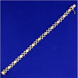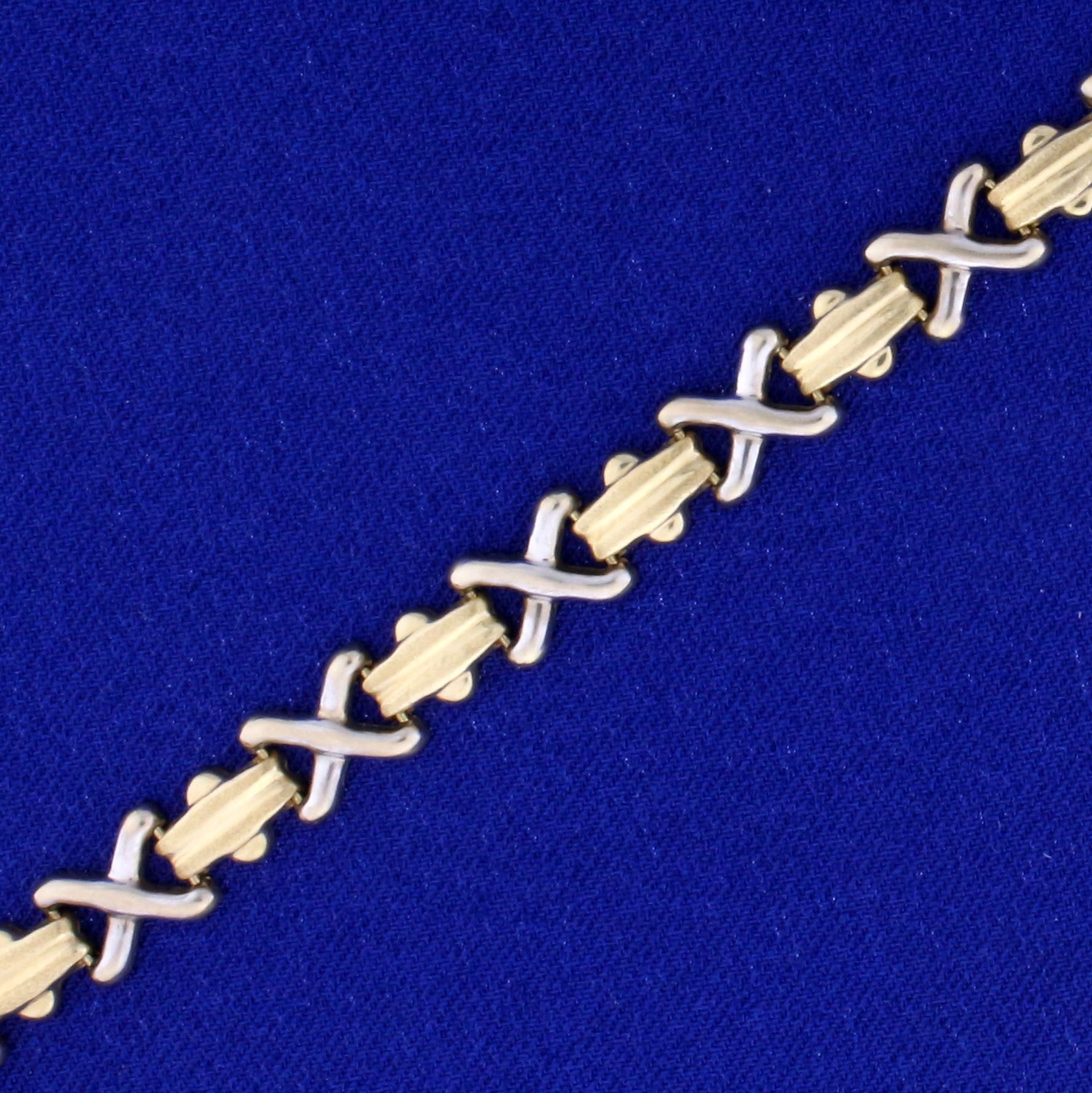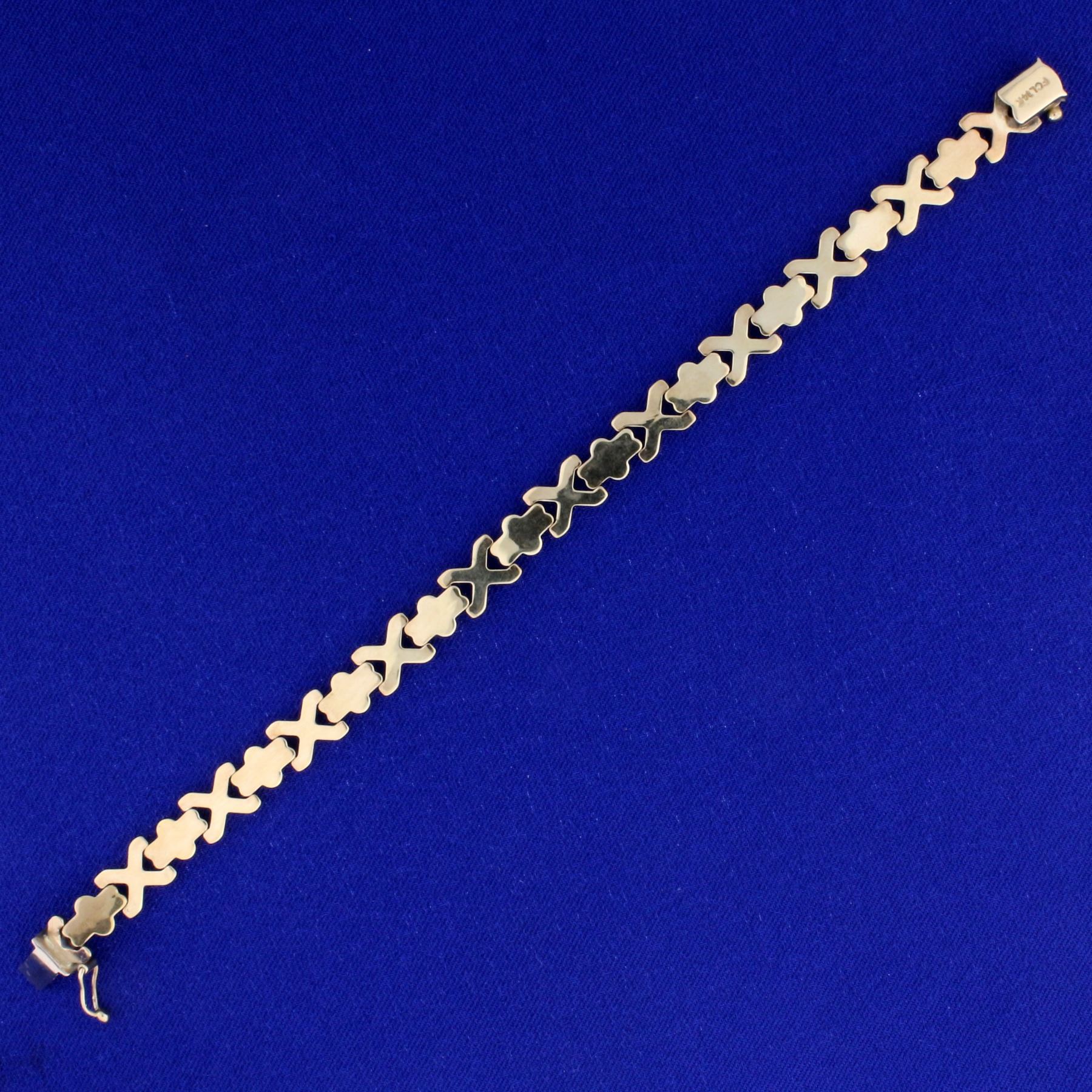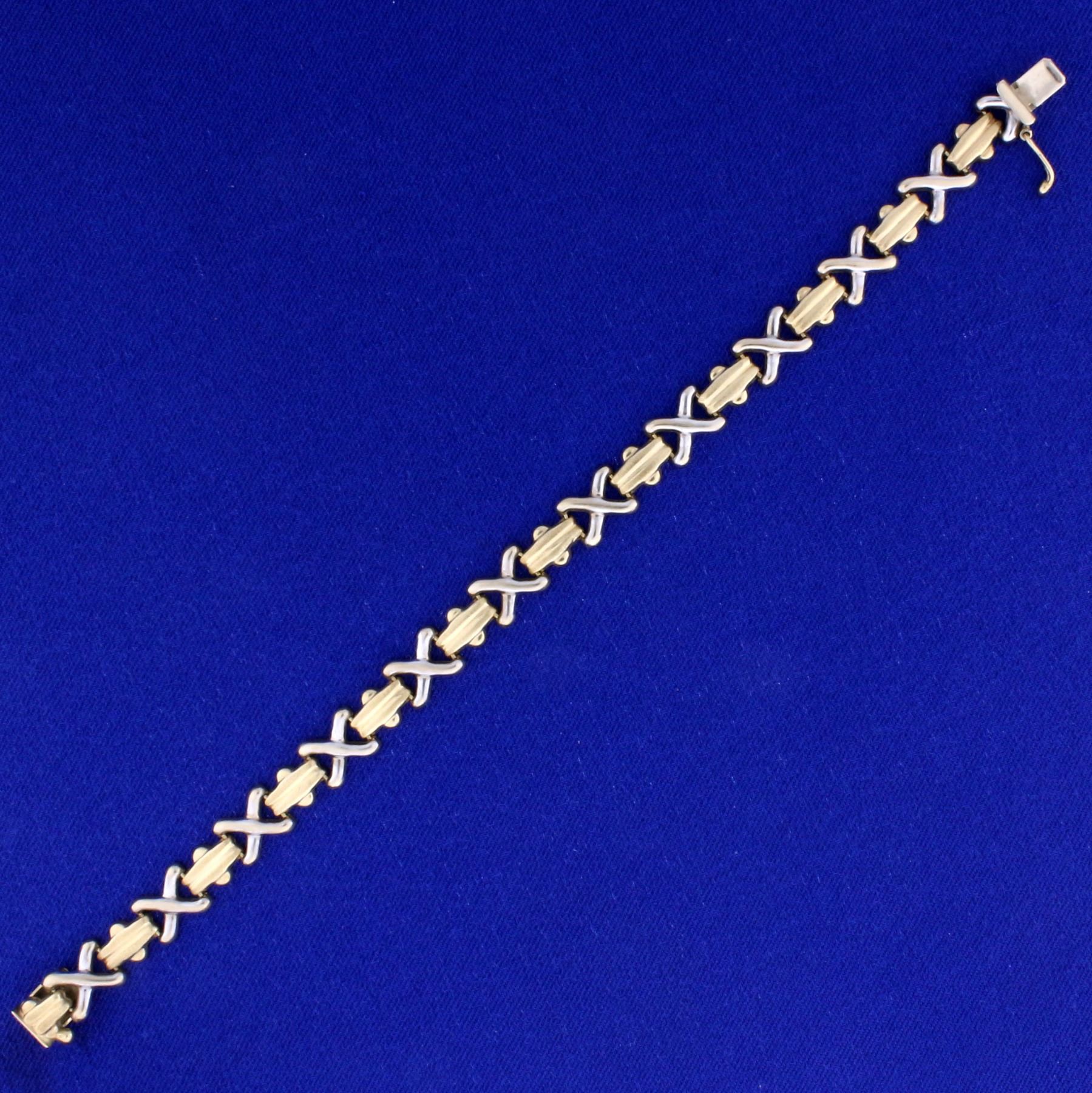 In 14k yellow and white gold. 7.7mm wide, with safety clasp. 8.8g