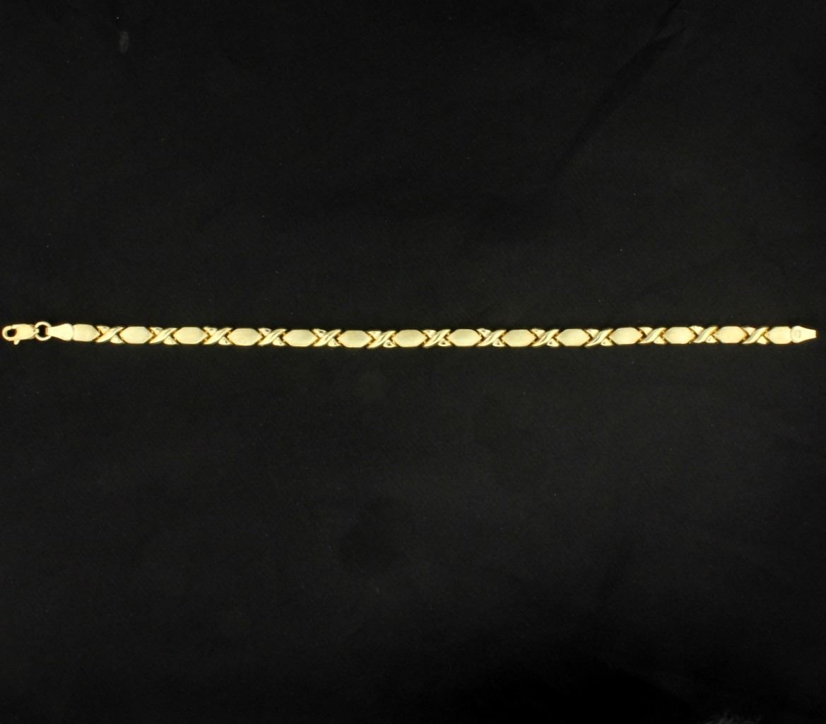The bracelet is 10K yellow gold and is 4mm wide, it has a lobster clasp. 3.3g