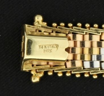 Italian Made 14K gold, it is 10.3mm wide and has a safety clasp. 1 9.0g