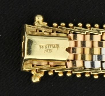 Italian Made 14K gold, it is 10.3mm wide and has a safety clasp. 1 9.0g