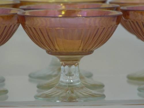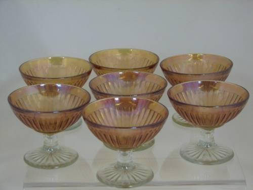 7 Iridescent Amber Depression Sherbets. Pattern - ROUND ROBIN. Produced 1927 -1932 by an unknown manufacturer. No chips, cracks or scratches.