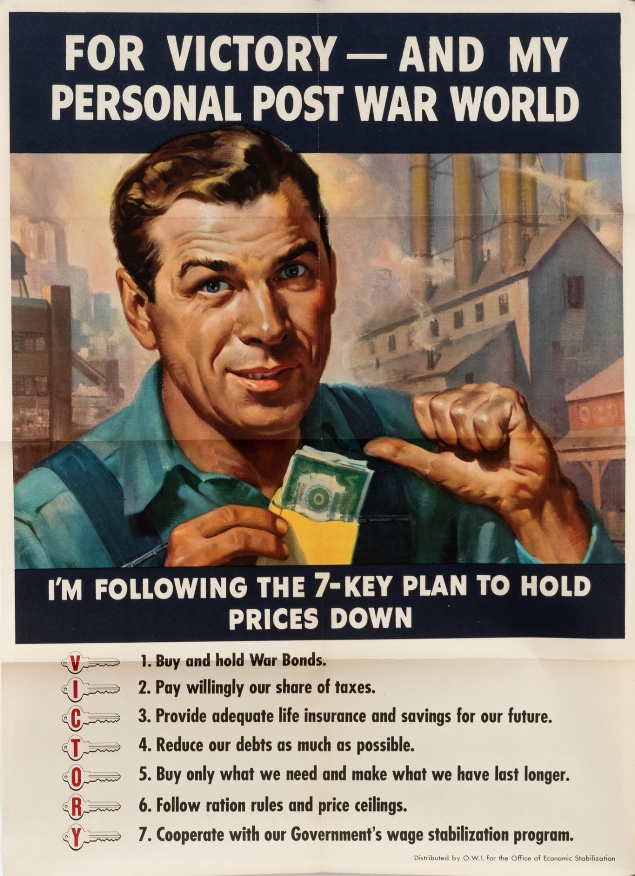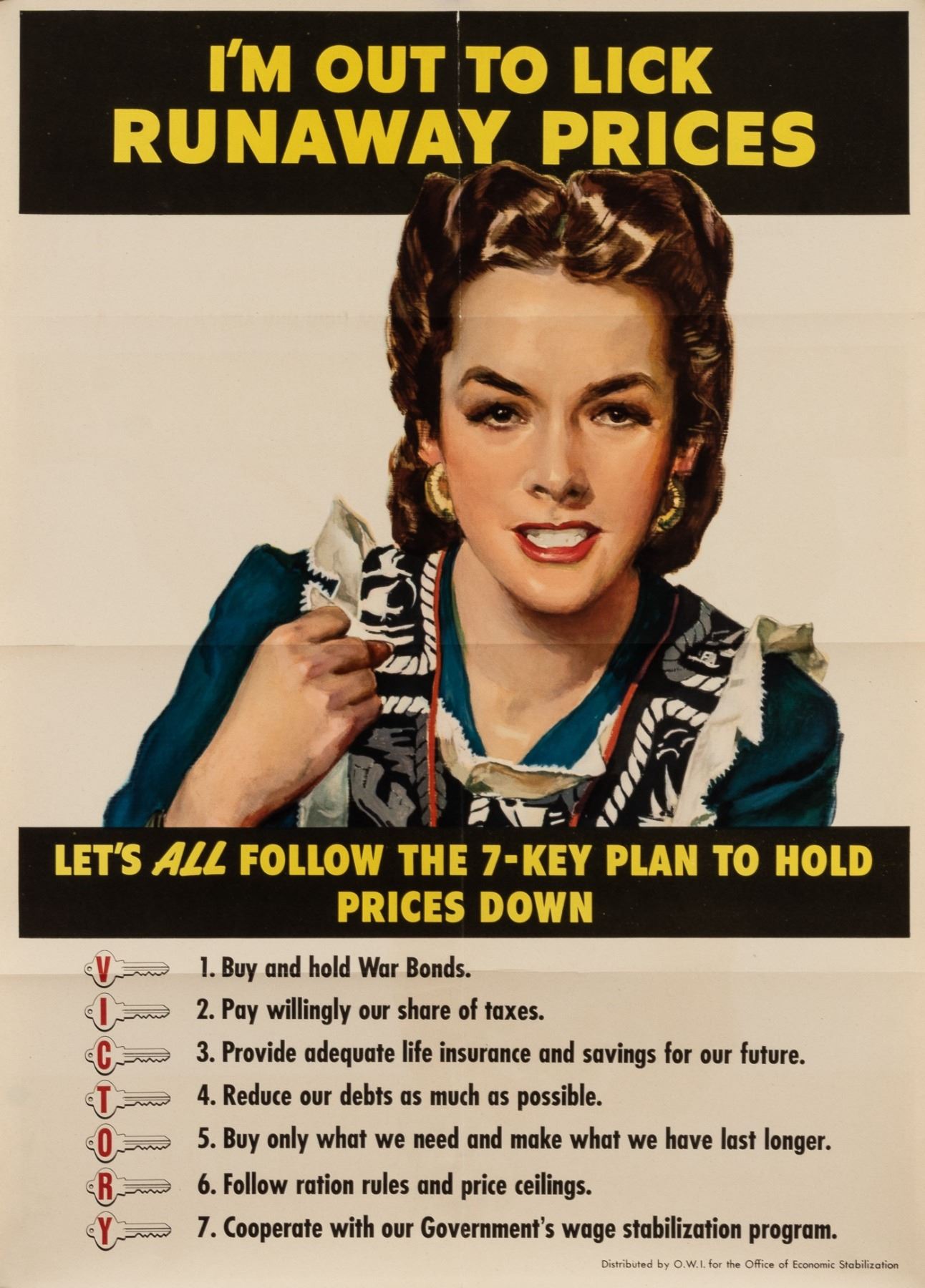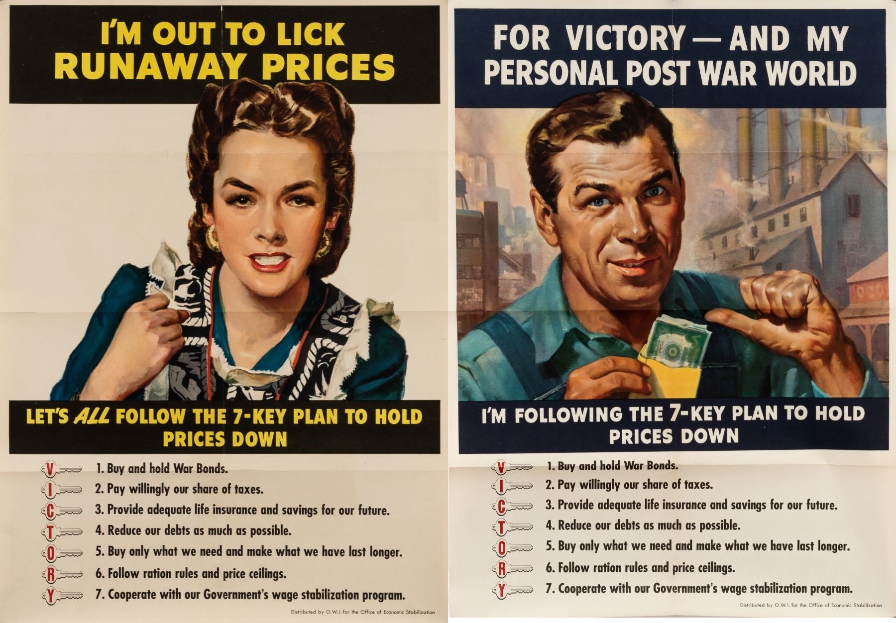 Two posters of the '7-Key Plan' made for Americans during the war to combat inflation. 1. 'For Victory - and My Personal Post War World', O.W.I. for the Office of Economic Stabilization, 1942, 20 x 28 inches. Minor splits and three horizontal folds. 2. 'I'm Out to Lick Runaway Prices', O.W.I. for the Office of Economic Stabilization, 1944, 20 x 28 inches. 2-inch split on left edge, 1-inch split at top, and three horizontal folds.