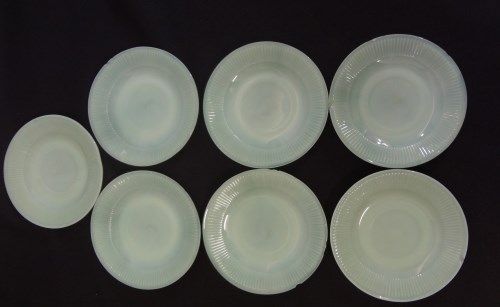 7 6" SAUCER PLATES. SOME ARE CHIPPED. FAIR CONDITION. NO MARKINGS. Est Value $5.00-10.00