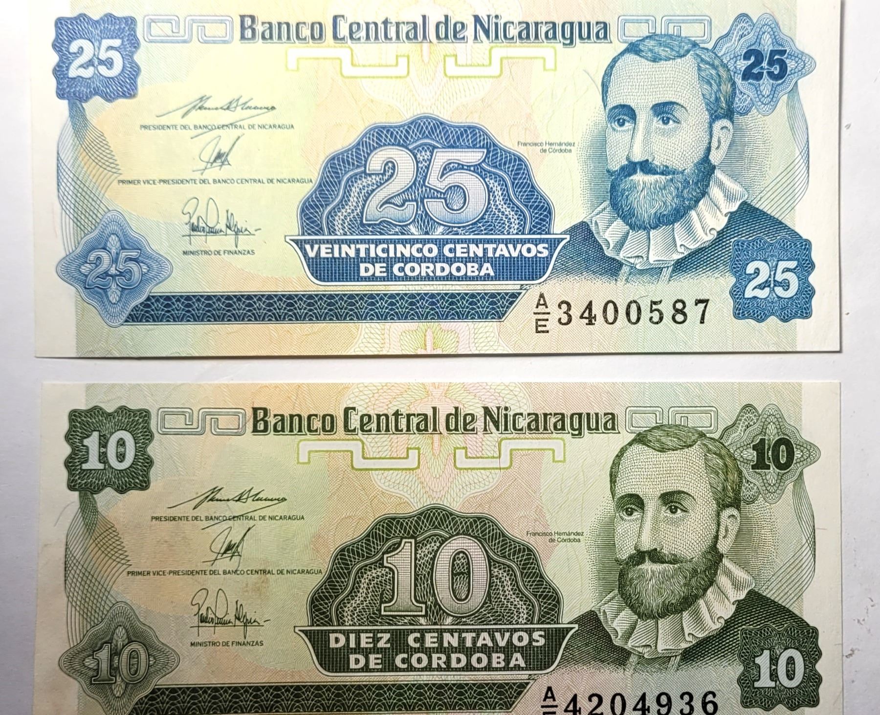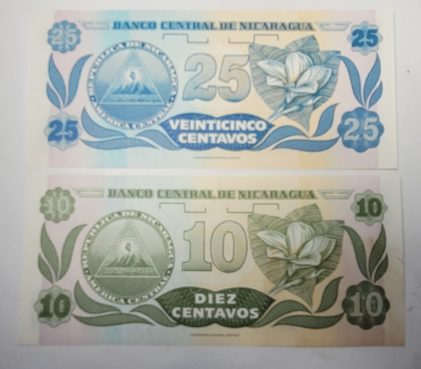 NICARAGUA, BOTH FROM 1991: 10 & 25 RUPEE. CURRENCY