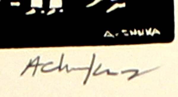 7 Linocut Block Prints by Andy Chuka, visual measures 4'' x 5'', includes: 1 is an artist proof of Conestoga Wagon, Sunflower #31/100, Man on Burro #39/100, Snake Dancer #43/100, Men on Horses #36/100, Desert Landscape #32/100, Senorita Dancing #36/100, all are hand signed and have embossed stamps, FYI: ''Chuka is a well documented southwest artist. Andy Chuka was born in Hungary in 1898. At the age of 16, Andy was awarded a scholarship to study art in the United States. Andy's Aunt & Uncle moved to Phoenix so Andy followed. He earned his first dollar in 1923 for printing 100 business cards for a Phoenix Union High School graduate. Andy passed away in 1972.''