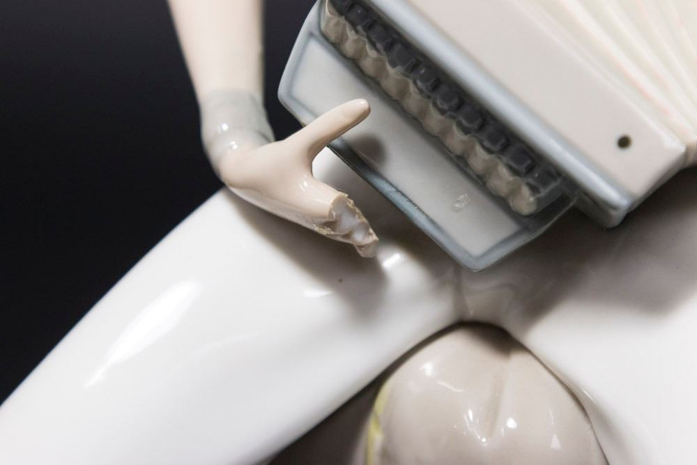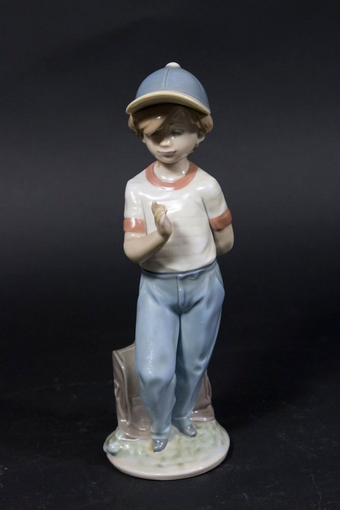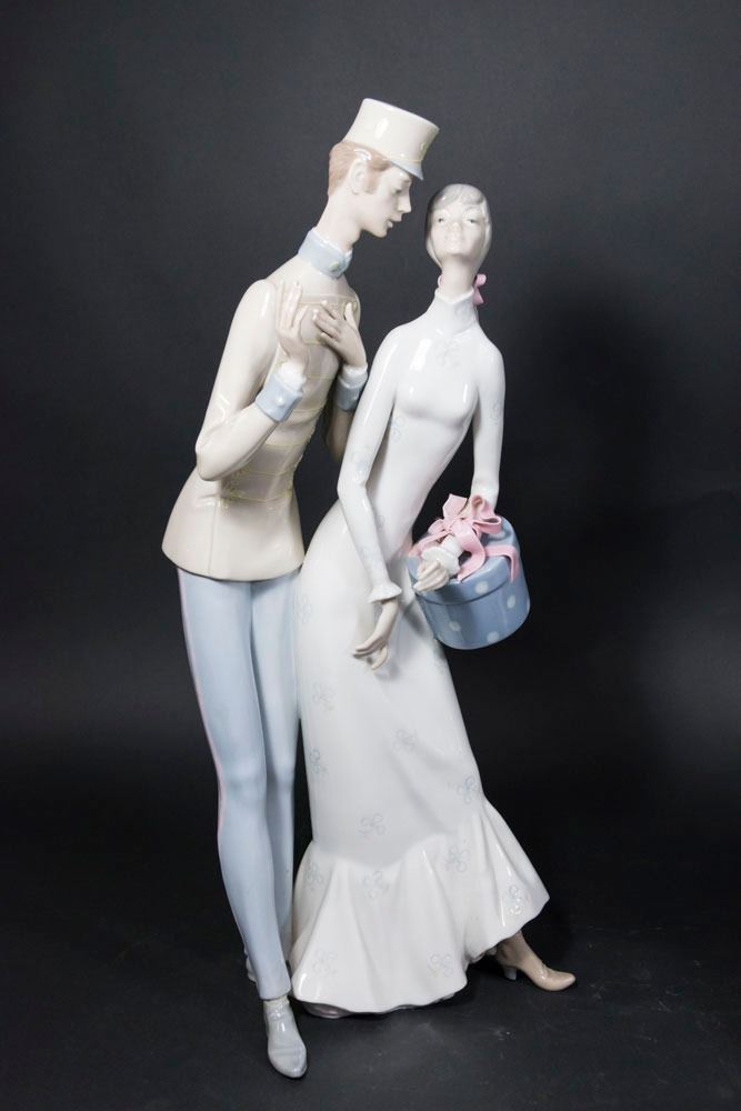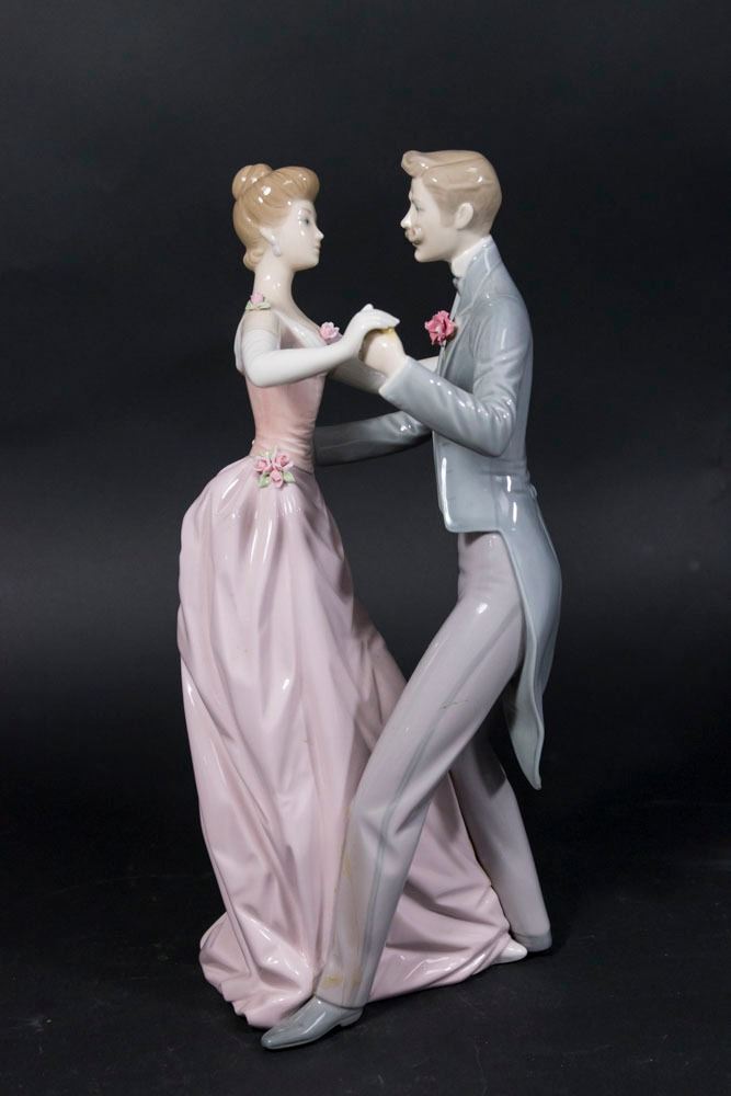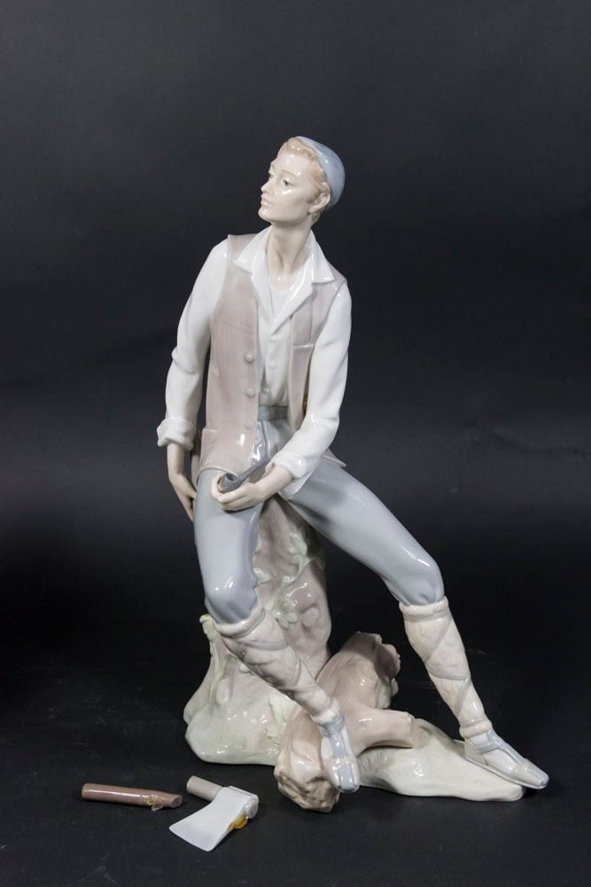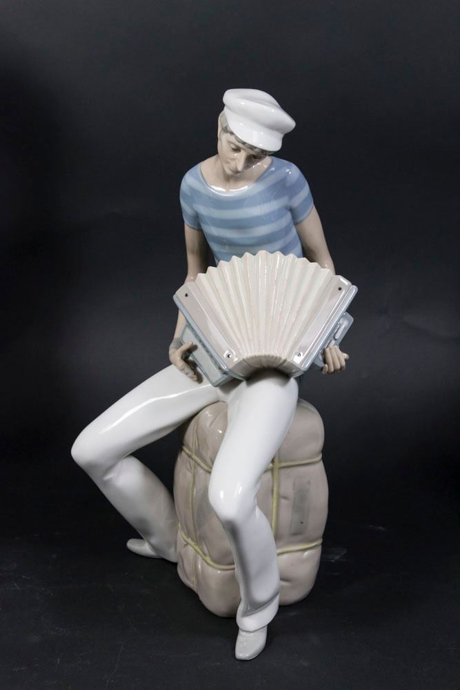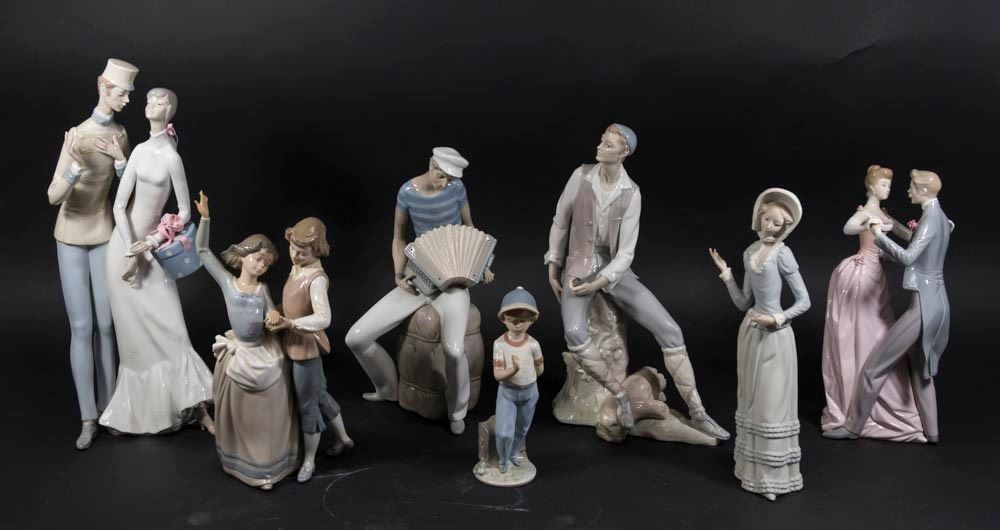 Including accordion player #4606, approx. 13" H; anniversary waltz, approx. 12 3/4" H; seated man with ax; boy with baseball bat; soldier & woman, approx. 17" H; woman with hat; and young dancers. (6072) Minor losses on each (fingers etc.).