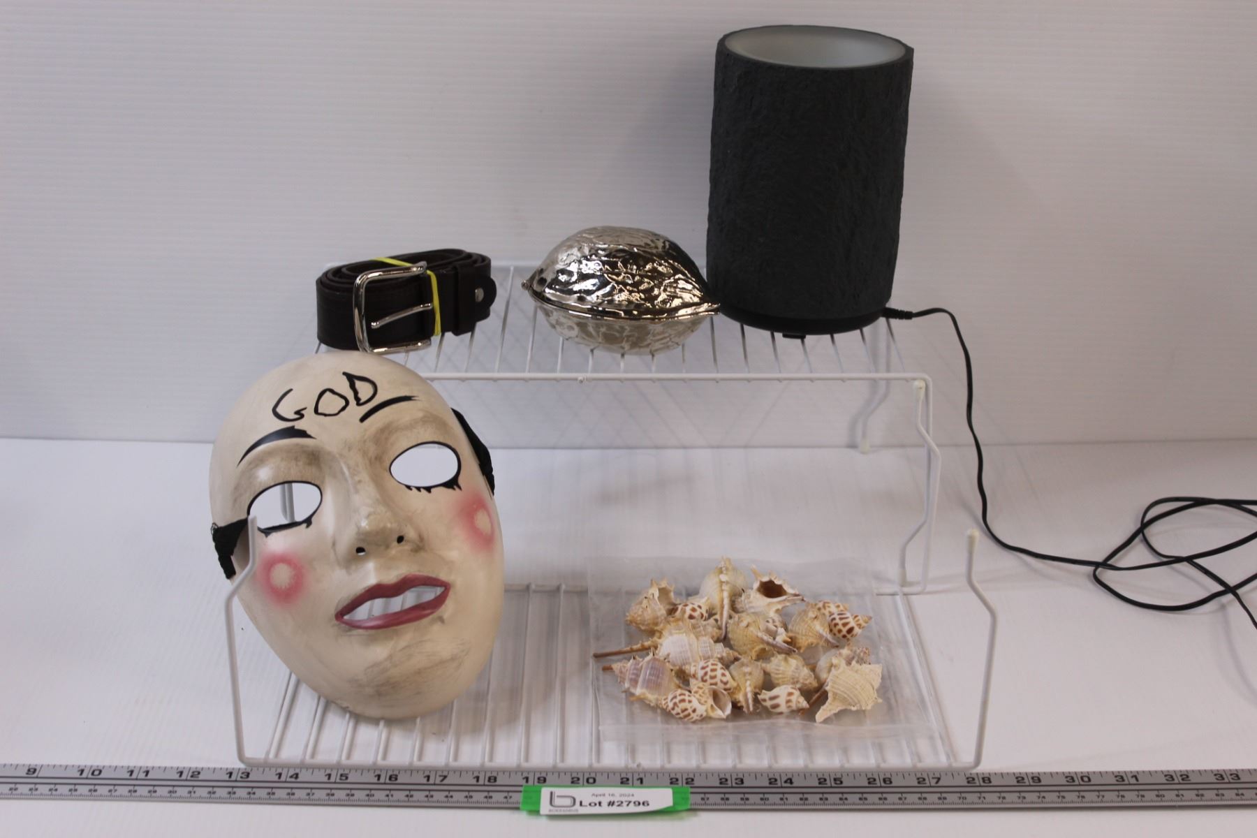 (7) Lot of Misc. Items: Mask; Chrome Nut Cracker; 20+ Seashells; 2-racks; Diffuser - powers on