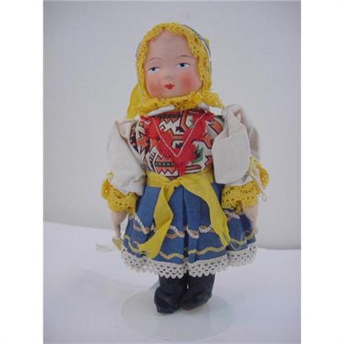 What a cutie! She stands 7" tall, is all original and in mint condition. There is a gold hand tag that says MADE IN CZECHOSLAVAKIA and she also has the KIMPORT DOLLS Independence, MO This Doll Was Made in CZECHOSLAVAKIA label on the skirt. Body is cloth and head is a hard but hollow material, am not sure what it is. Painted features, molded hair. Wonderful authentic regional costume. KIMPORT offered dolls from other countries for along time, but I think this one is from the 1940s or early 1950s.