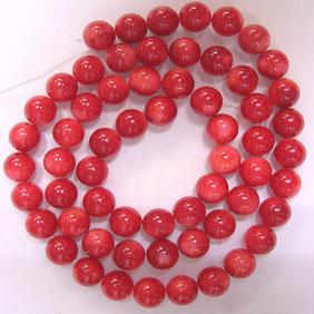 ROUND RED BAMBOO CORAL STRAND. EACH BEAD MEASURES 7 MM DIAMETER. COLOR ENHANCED. LENGTH OF THE STRAND: 16 INCHES