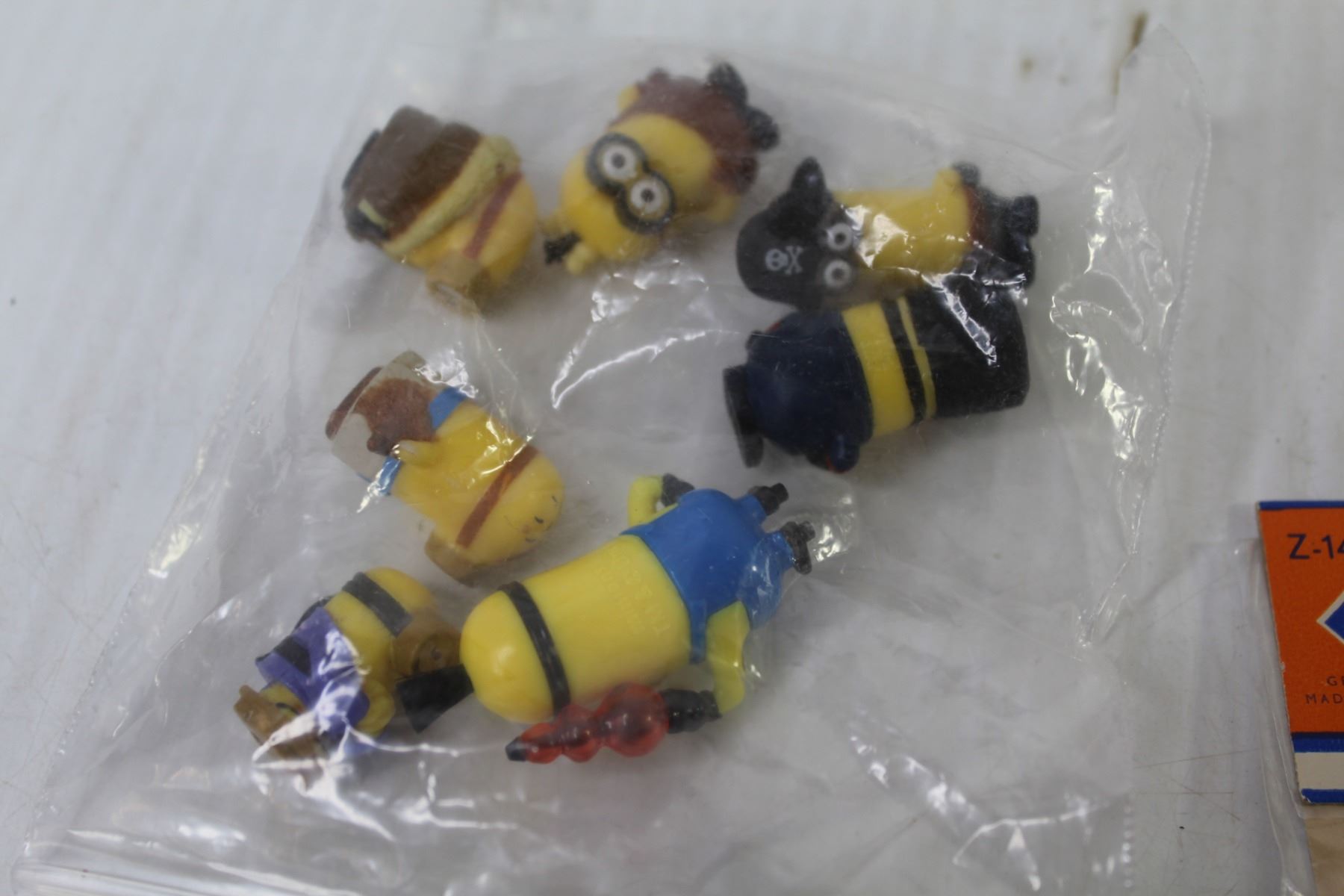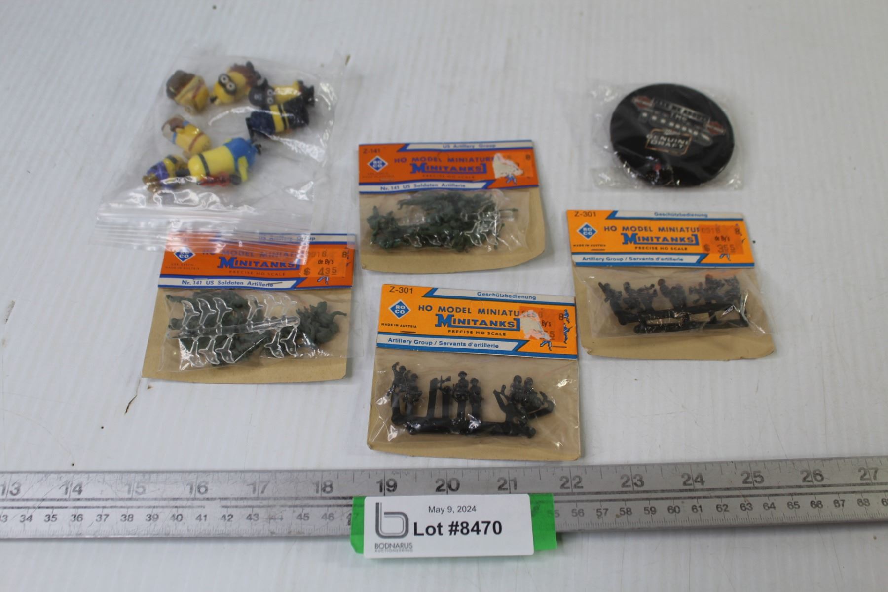 (7) Minion Figurines - Ask Me About the Twins, Harley Genuine Draft Button Pin (flashing light works) - (4) Packs of Vintage HO Army Soldiers