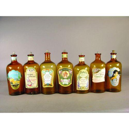 7 Misc. Toiletry Bottles including Ixora Water. Amber bottles with original caps and paper labels. All in excellent condition, 7 1/2 inches tall.