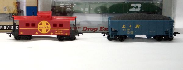 7 Model Train Cars, Walthers, Proto 2000, longest measures 11.5'' x 1.25'', #1 Proto 2000 Series Drop End Mill gondola BN#566172 #2 Walthers Gold Line Airslide Covered Hopper #932-3723 #3 Durango Cattle Car #40394 #4 SOO Line Car #178289 #5 L & N Coal Car #115391 #6 Amtrak #174 Passenger Car #7 Santa Fe RR Caboose ATSF 999851