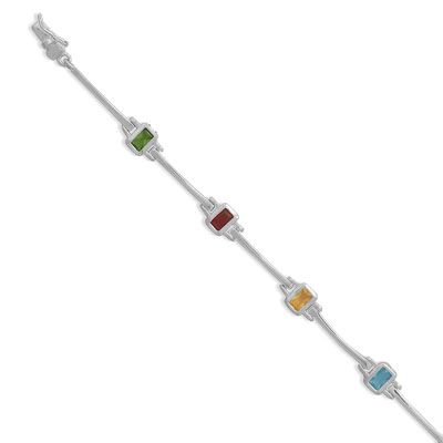 5x3mm purple, blue, yellow, red, and green CZs are separated by 20mm long silver links. Features a box clasp. .925 Sterling Silver