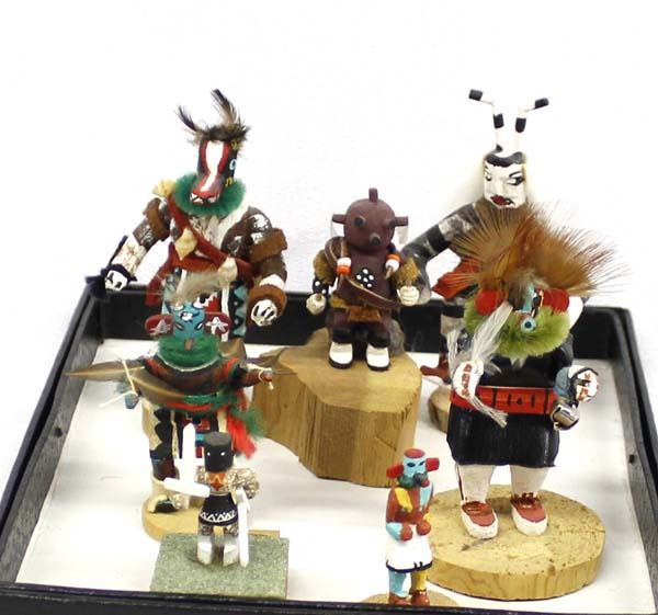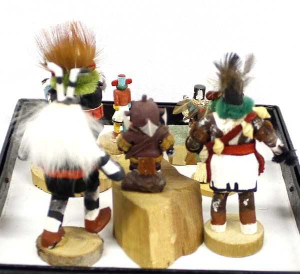 7 Native American Hopi Miniature Kachinas, includes 1. Apache Crown Dancer by L. Morgan, 1990 2. Morning Singer by G.W. 3. Logune Corn by V.G. 4. Sriip-e, unsigned 5. Badger by C. Johnson 6. Koshare Clown, unsigned 7. Mudhead by Bess Yanez, largest measures 3'' x 1.75''