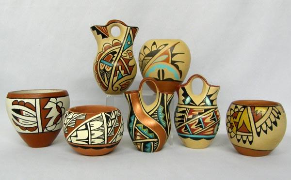 7 Native American Jemez Pottery Signed. Some signatures include: Adrea Tsosie, Rose Sandia, M.S. Toya, etc. Largest piece measures approx. 4 1/2''H x 3''W. Buyers Pay Actual Shipping and Handling Charges(see terms and conditions for more information).