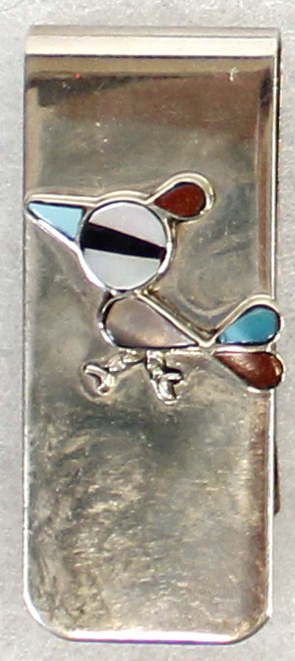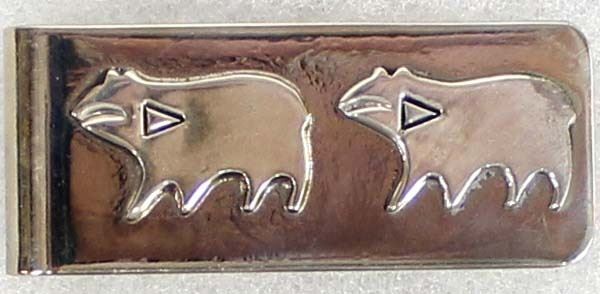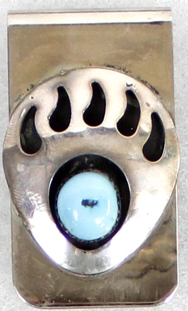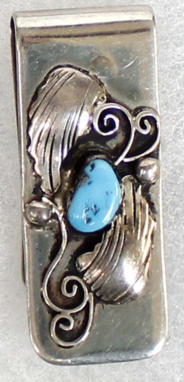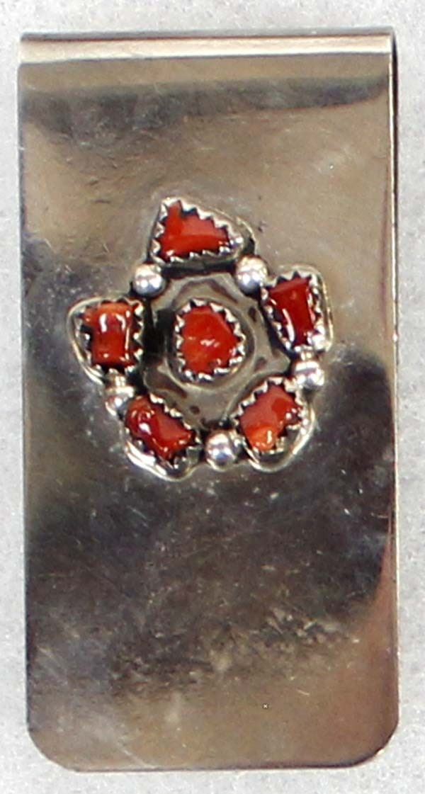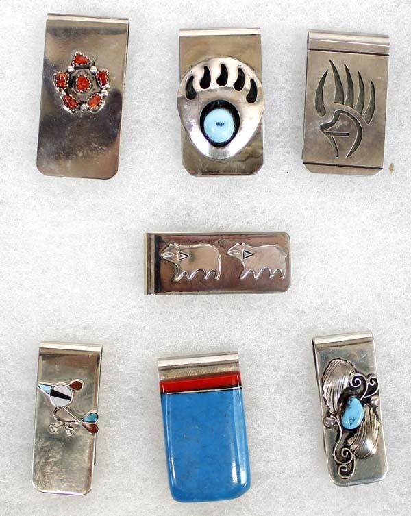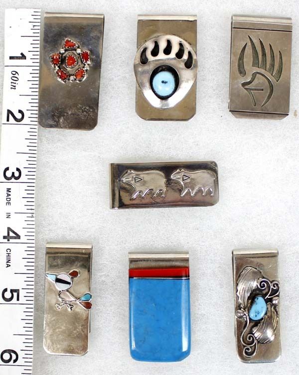 7 Native American Money Clips, largest measures 3'' x 1'', the etched bear paw money clip is by Monica Van Riper (Anglo Artist) hallmarked and stamped sterling, includes cloral cluster, turquoise bear paw, double bear, Zuni Thunderbird (mother of pearl, coral, onyx, abalone), turquoise & coral overlay, and turquoise & leaf motif, nice selection