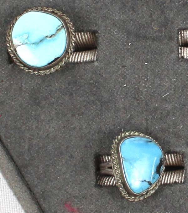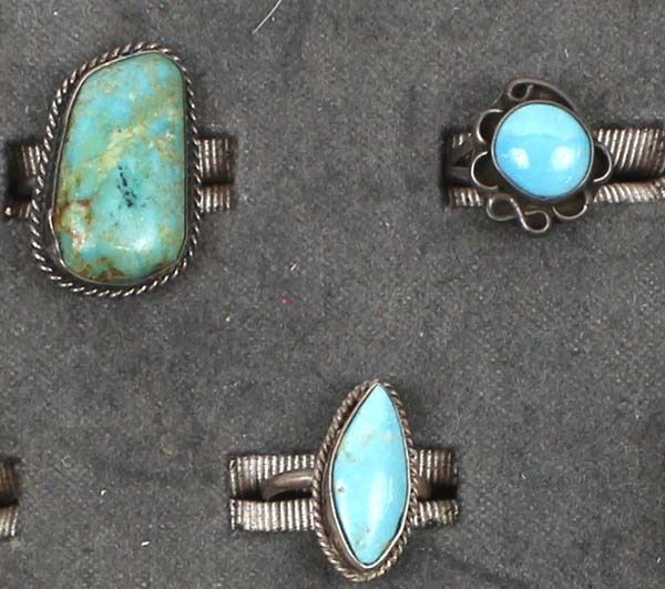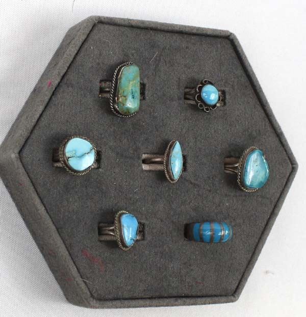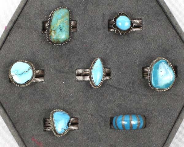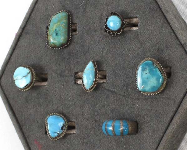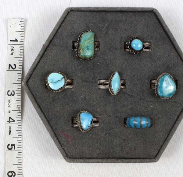 7 Native American Navajo Sterling Turquoise Rings, sizes include 2.5, 4.5, Two size 5, 7, 5.5, 8, largest measures 1 1/8''L