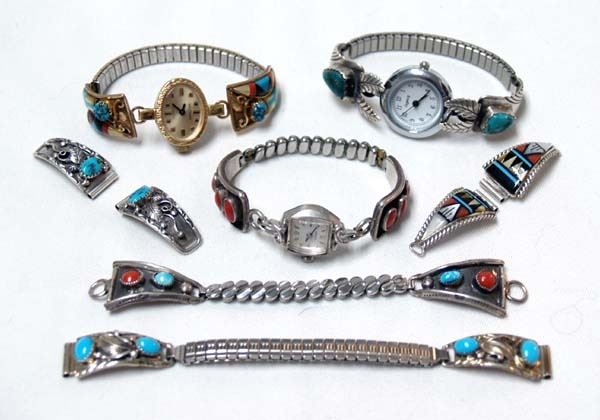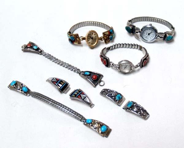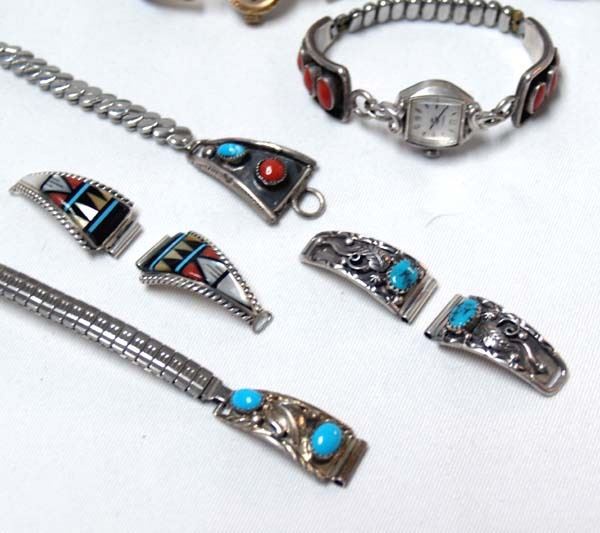 7 Native American Navajo Sterling Watch Bands, includes 3 marked with no watches, tips by Chee, gold filled with inlay and Waltham Watch which runs, sterling coral with Caravelle Watch which runs, turquoise and leaves with Legacy Watch which runs