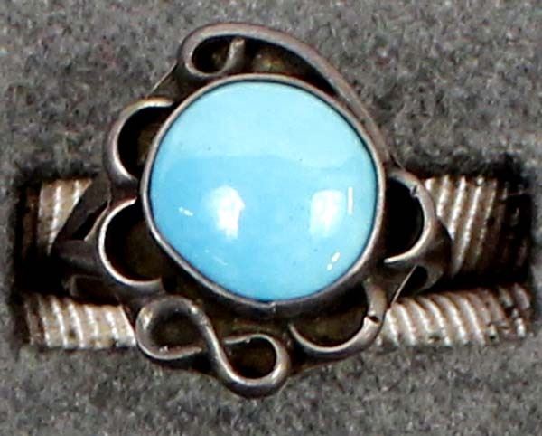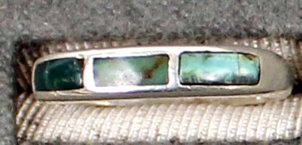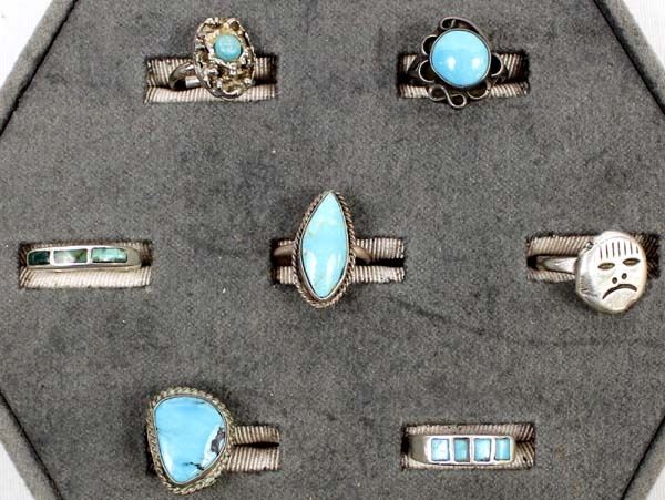 7 Native American Sterling Silver Rings, varous sizes ranging from 2.5 to 6.5, one of the inlay ring has one stone which has recessed down into the setting, longest ring measures 7/8''L