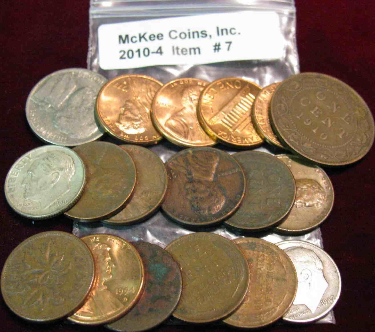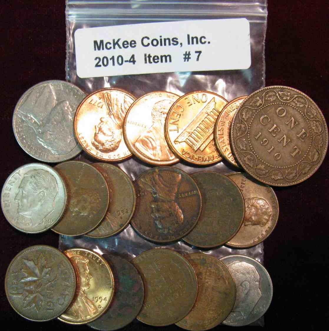 7. Old U.S. Indian Cent; Canada small & large Cent; Jefferson Nickel; (5) Memorial Cents; (7) Wheat Cents; & (2) Silver Roosevelt Dimes. A nice old accumulation.