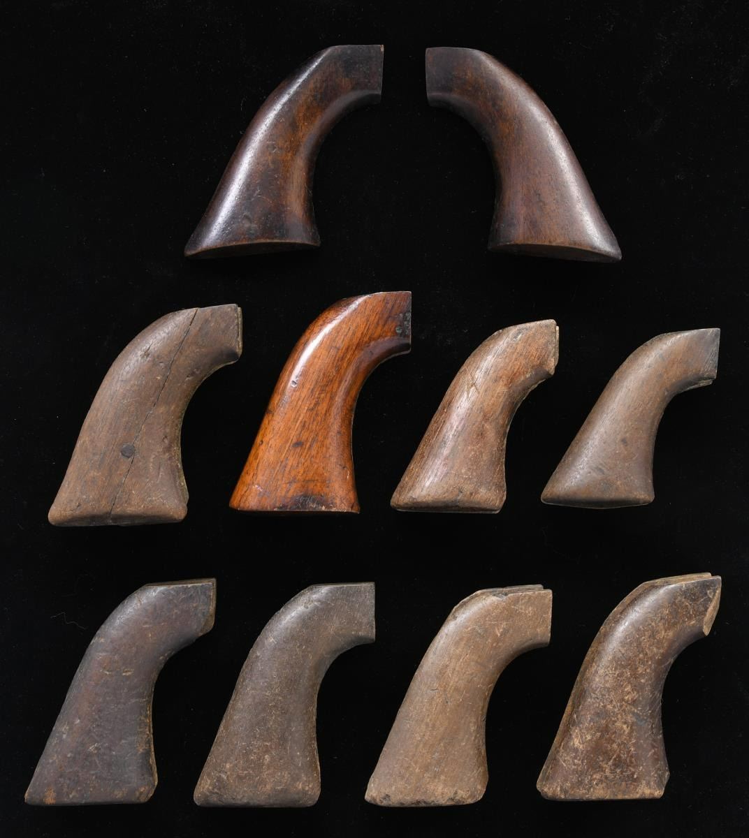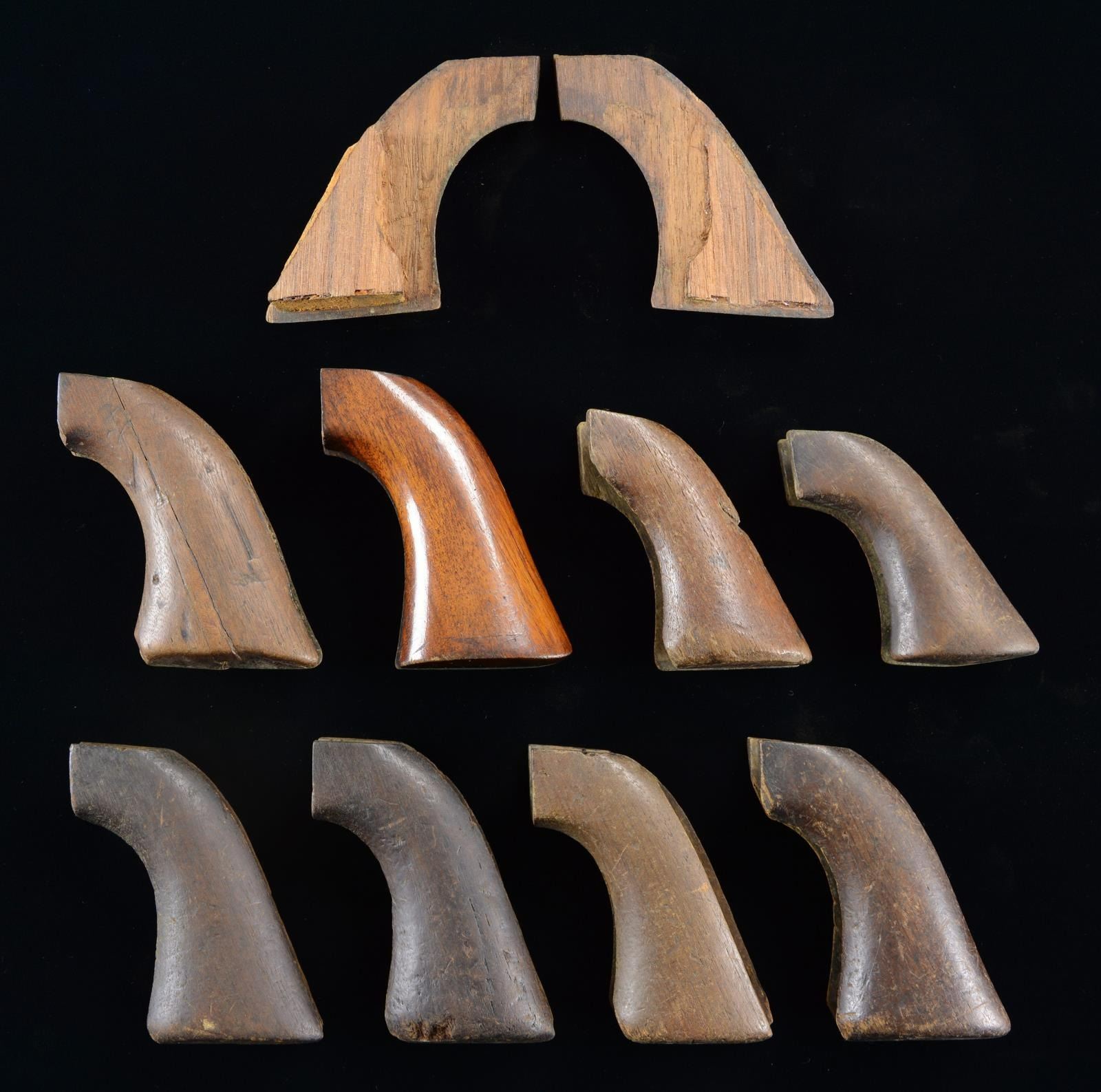 MODEL 1849 POCKET GRIPS. One pair Army is fine retaining most original factory varnish, one fair pair martial grips with 4 digit S# and discernible cartouche; other 4 pairs are rough. CONDITION: poor-fair on 6 martial Army pairs, one civilian pair is very good to fine. Pocket grips both well worn but complete with partially discerned S#s. PROVENANCE: Martin Lane Historic & Western Americana Lifetime Collection. (02-21380-2/JS). $300-400.