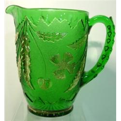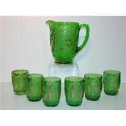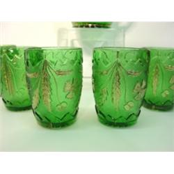 7 piece Delaware glass water set consisting of pitcher & 6 tumblers. Green in color with gold leaf & berry design. Minimal wear to gold decoration on pitcher and tumblers. Pitcher: 7" H, Tumbers: 4" H