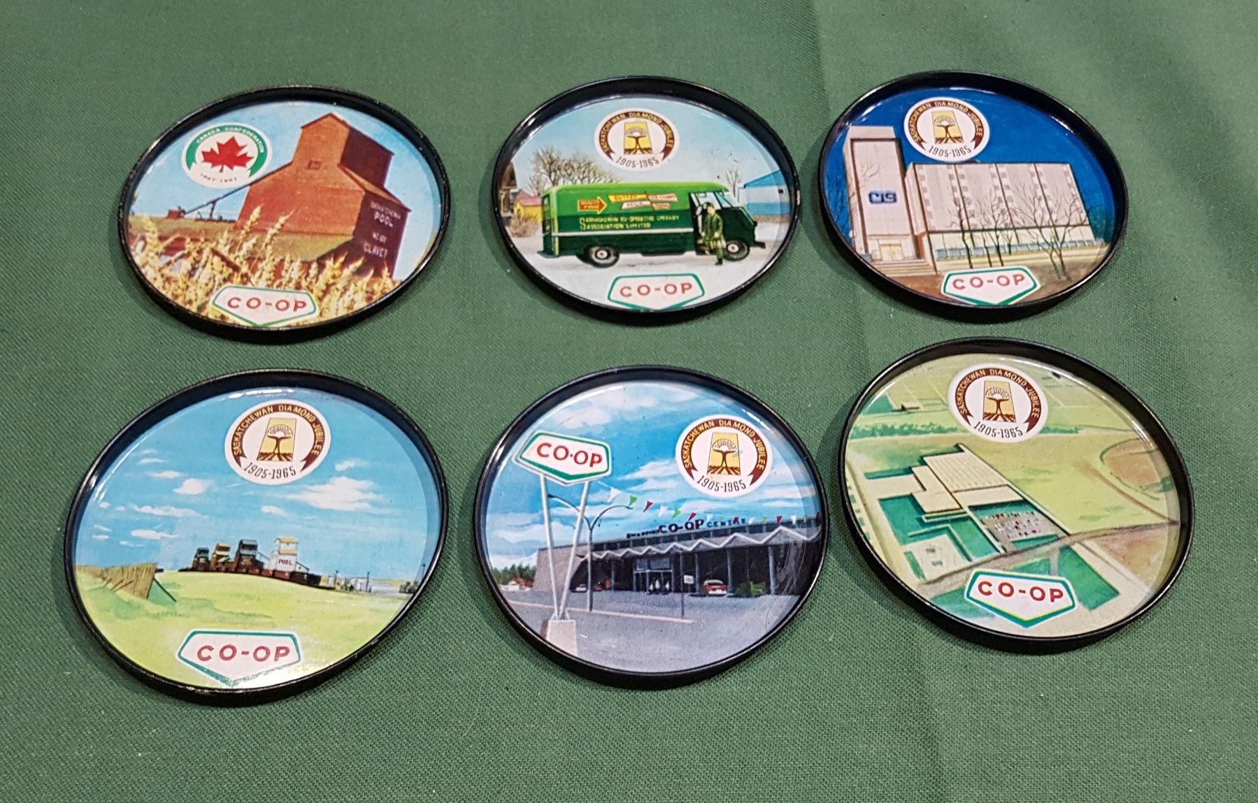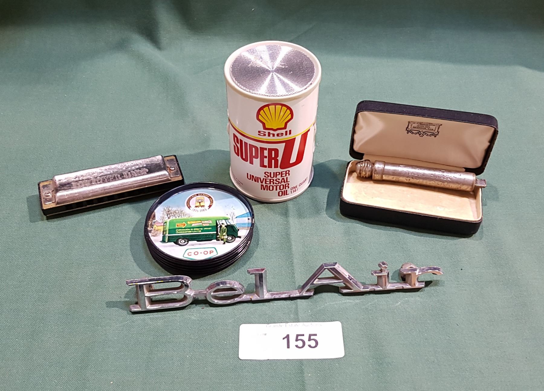 EARLY CO-OP COASTER SET, HARMONICA, 1932 SCHRAEDER TIRE GAUGE ETC