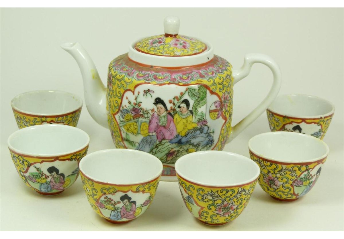 A 7 piece tea set of Chinese hand painted enameled porcelain. Each having scenes depicting maidens in a courtyard garden scene and having scrolled lotus blossom border design over yellow ground. Each holds four character Qianlong (1736-1795) period marks to bottom but probably made late Qing to Republic period. Teapot measures 6 1/4" height (15.8cm). Cups measure 2" height x 3" diameter (5.1cm x 7.6cm). Total weight of 1103 grams.