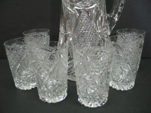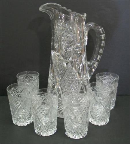 7 PIECE AMERICAN CUT GLASS SET. Consists of pitcher and six tumblers. Pitcher has clear glass applied handle. Pitcher: 12” H. Tumber: 4” H