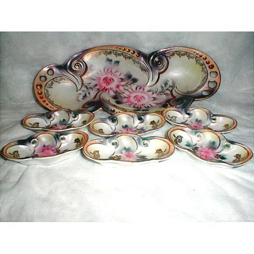 THIS SALE IS FOR A BEAUTIFUL 7 PIECE NUT SET THAT IS IN VERY GOOD CONDITION WITH NO CHIPS, CRACKS, OR REPAIRS. THE MASTER BOWL MEASURES 1 3/4 IN. TALL, 12 IN. IN LENGTH, AND 5 1/4 IN. WIDE. EACH INDIVIDUAL NUT DISH MEASURES 3/4 IN. TALL, 4 1/2 IN. IN LENGTH, AND 2 1/2 IN. WIDE.<P> EACH PIECE IS MARKED, MADE IN GERMANY, AND EACH HAS LOVELY COLORS OF PINK, BLUE, LAVENDER, PEACH ON AN OFF WHITE PORCELAIN BACKGROUND THAT HAS A SATIN FINISH AND GOLD TRIM AROUND THE EDGES.