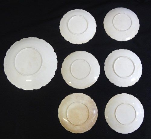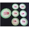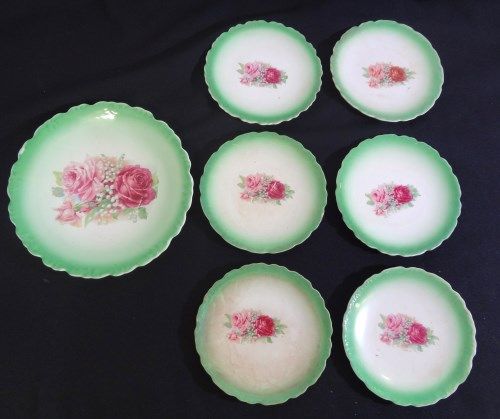 6 7" PLATES AND 1 10" PLATE. ALL PLATES HAVE ROSE PATTERN WITH GREEN TRIM. NO MARKINGS. FAIR CONDITION.