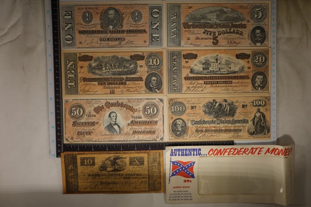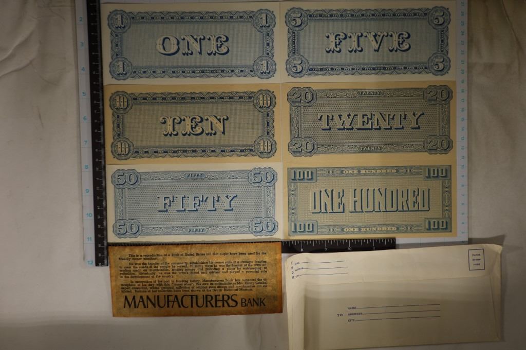 ENVELOPE. THERE IS A 6 PIECES SET: $1, $5, $10, $20, $50 & $100 ALL CRISP UNC. PLUS A SINGLE $10 REPRODUCTION OF A US BILL USED BY THE FRIENDLY CORNER MERCHANT. THIS IS A MANUFACTURERSN BANK REPRODUCTION TO RECREAT