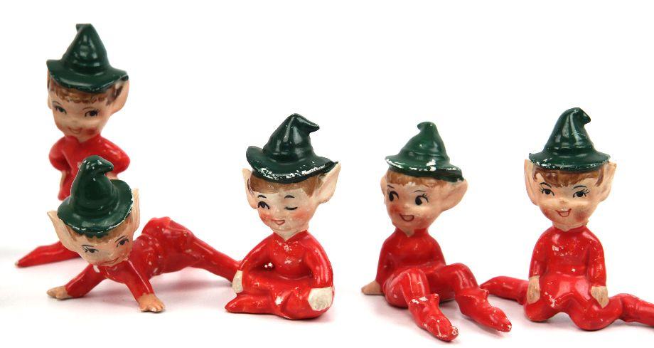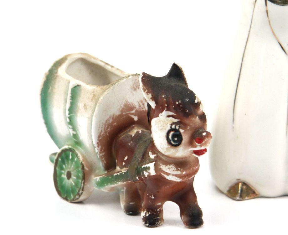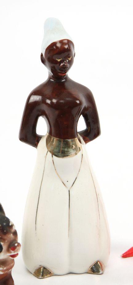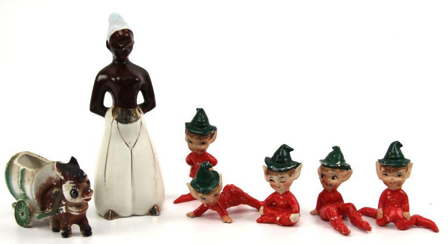 A grouping of 7 hand painted porcelain figurines from occupied Japan. Pieces include 7.75 inch African maiden, a 2.75x4.5 inch mule drawn wagon, and (5) elves ranging from 2.5 to 4 inches in height.