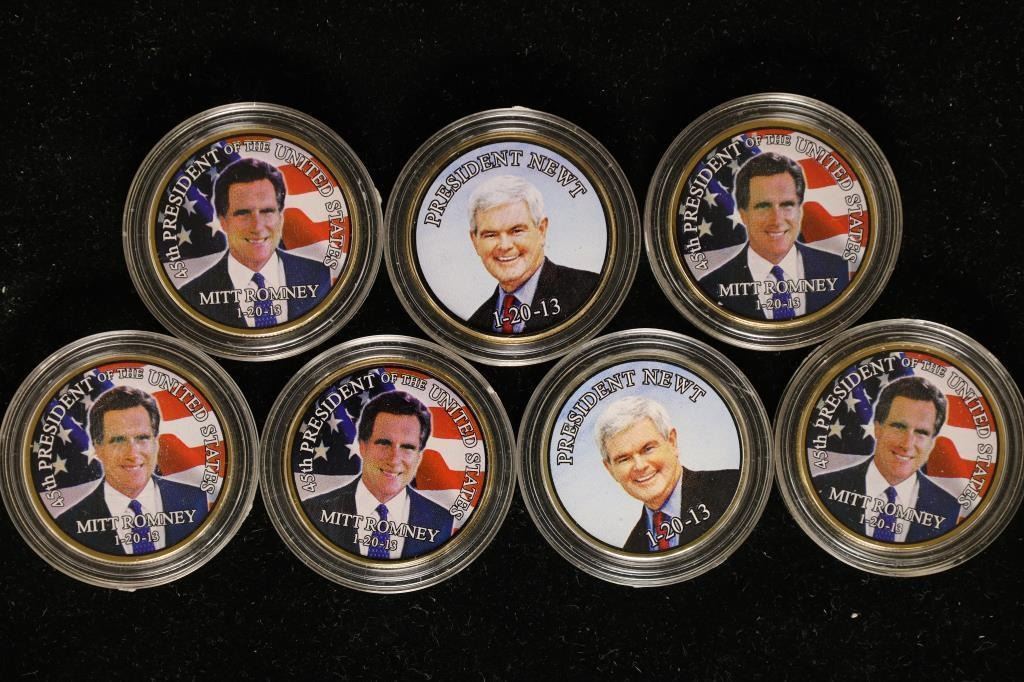 MITT ROMNEY, 1-GOLD COLORED PRESIDENT NEWT AND 1-SILVER COLORED PRESIDENT NEWT. 1 1/4" ALL BRILILANT UNC IN HARD PLASTIC CAPSULES.