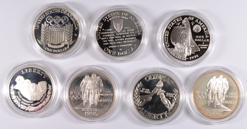 ( 7 ) PROOF U.S. COMMEMORATIVE SILVER DOLLARS, ALL IN ORIGINAL CAPSULES ONLY