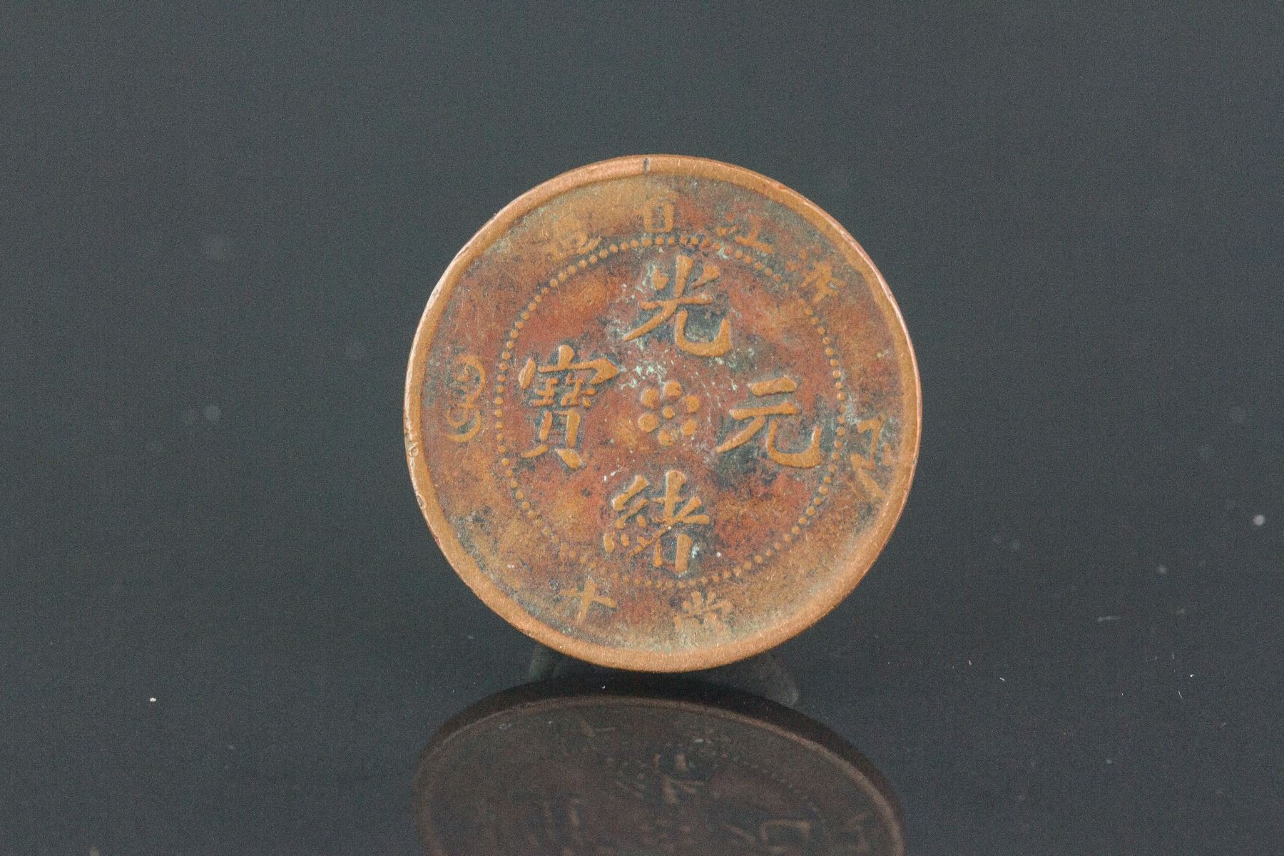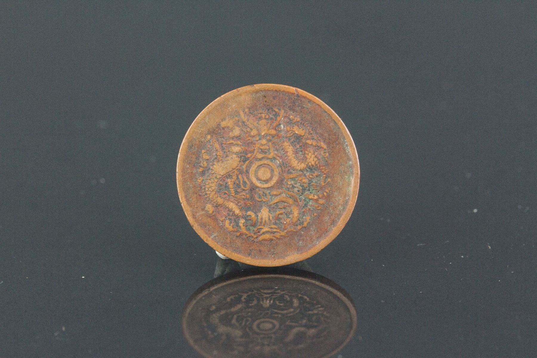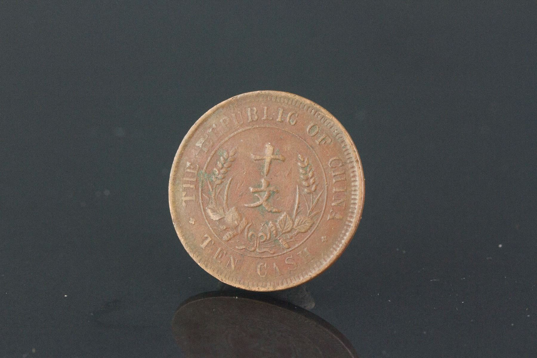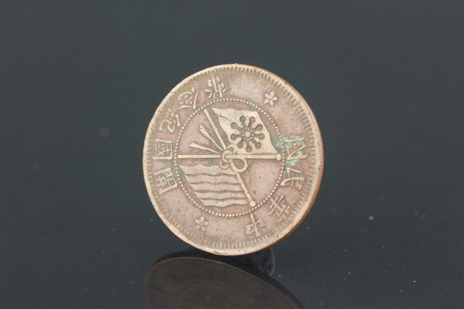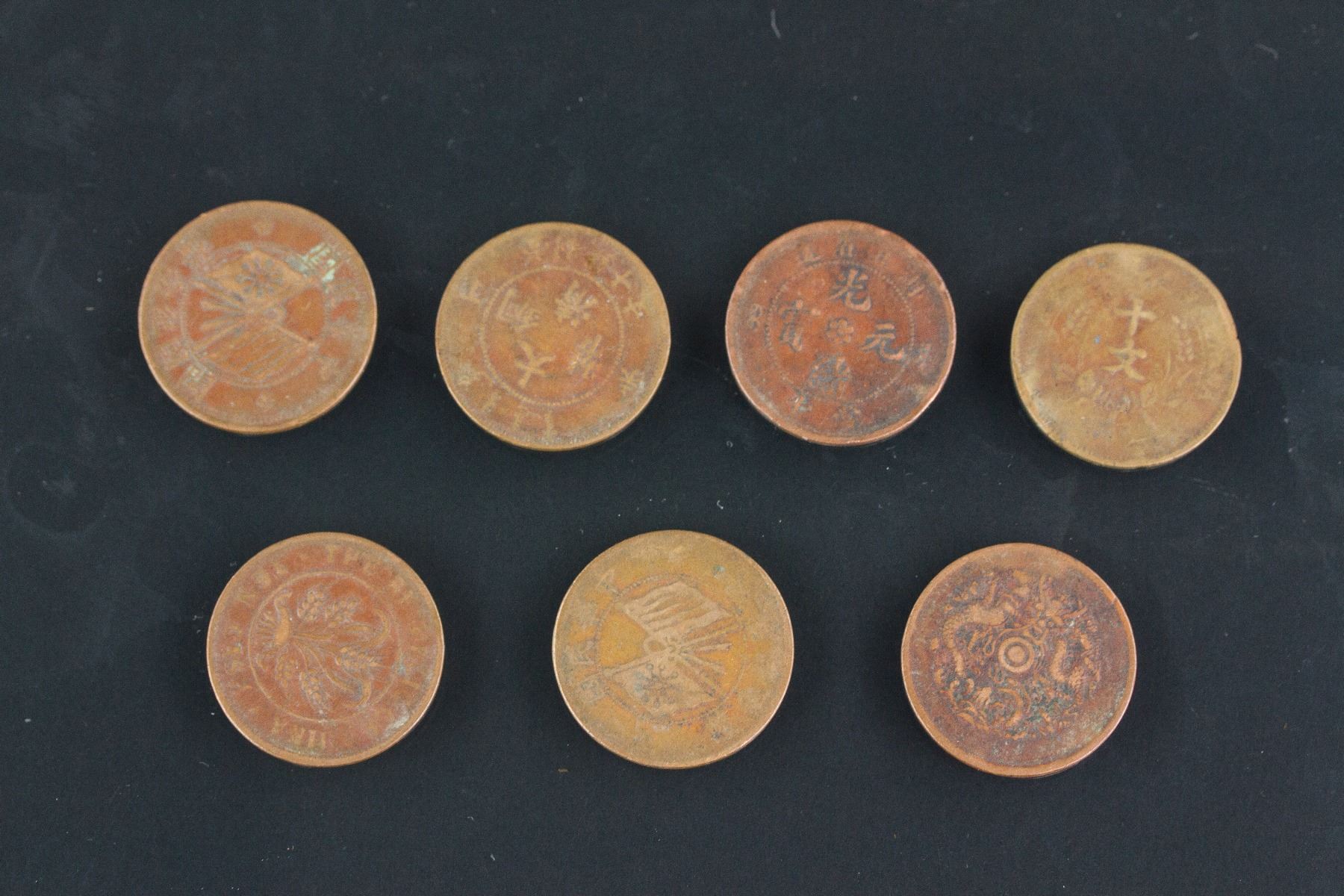 Seven pieces of assorted Chinese bronze coins; of four coins of the Republic of China and three coins of Guangxu; Republic coins have Chinese characters "Shi Wen" on obverse and national flag on reverse, except on has wheat on obverse; Guangxu coins have Chinese characters "Guang Xu Yuan Bao" on obverse and coiled dragon on reverse, except one has Chinese characters "Da Qing Tong Bi" on obverse; D: 2.5 cm each, 48 grams total; Provenance: private collection from Canadian numismatist
