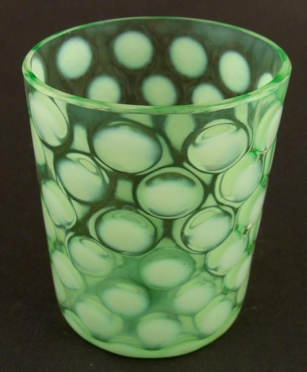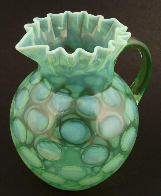This is a 7 piece Fenton Glass Green Vaseline Opalescent Pitcher Set. Included are one pitcher, and 6 glasses, all with nicely painted floral details. All are signed by the artists, and the pitcher has a Fenton mark. * Condition: ExcellentSignatures: A. Wowler (glasses), and Gilbert Lapin (pitcher) * Size of cups: 3 3/4" tall and 3" diameterSize of pitcher: 9" tall and 4 1/2" diameter *