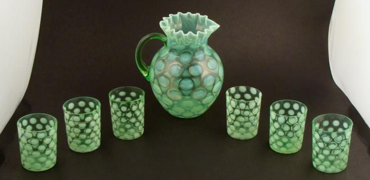 This is a 7 piece Fenton Glass Green Vaseline Opalescent Pitcher Set. Included are one pitcher, and 6 glasses, all with nicely painted floral details. All are signed by the artists, and the pitcher has a Fenton mark. * Condition: ExcellentSignatures: A. Wowler (glasses), and Gilbert Lapin (pitcher) * Size of cups: 3 3/4" tall and 3" diameterSize of pitcher: 9" tall and 4 1/2" diameter *