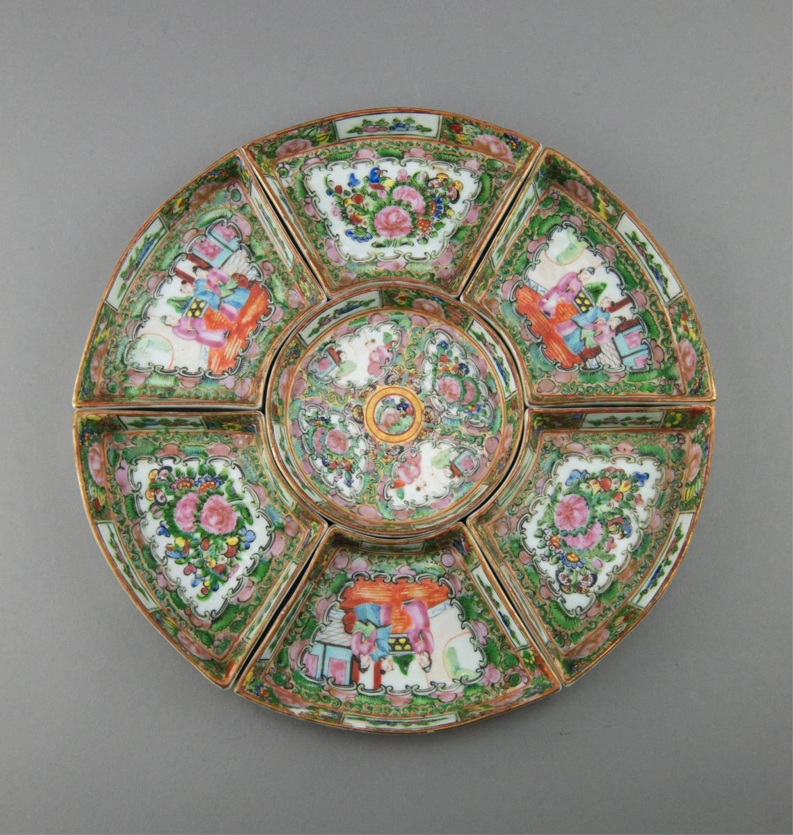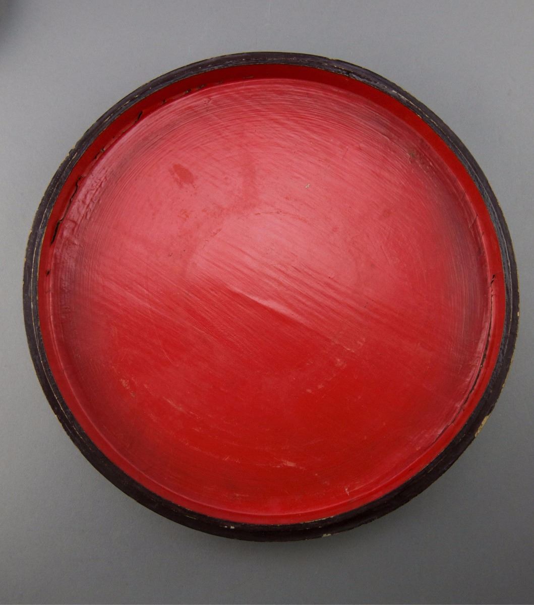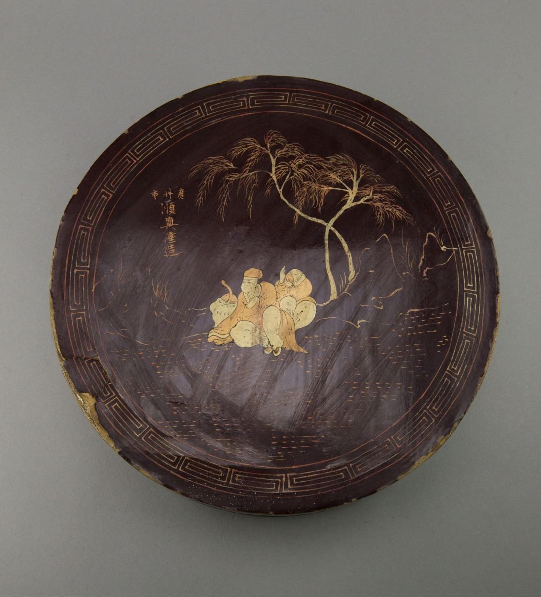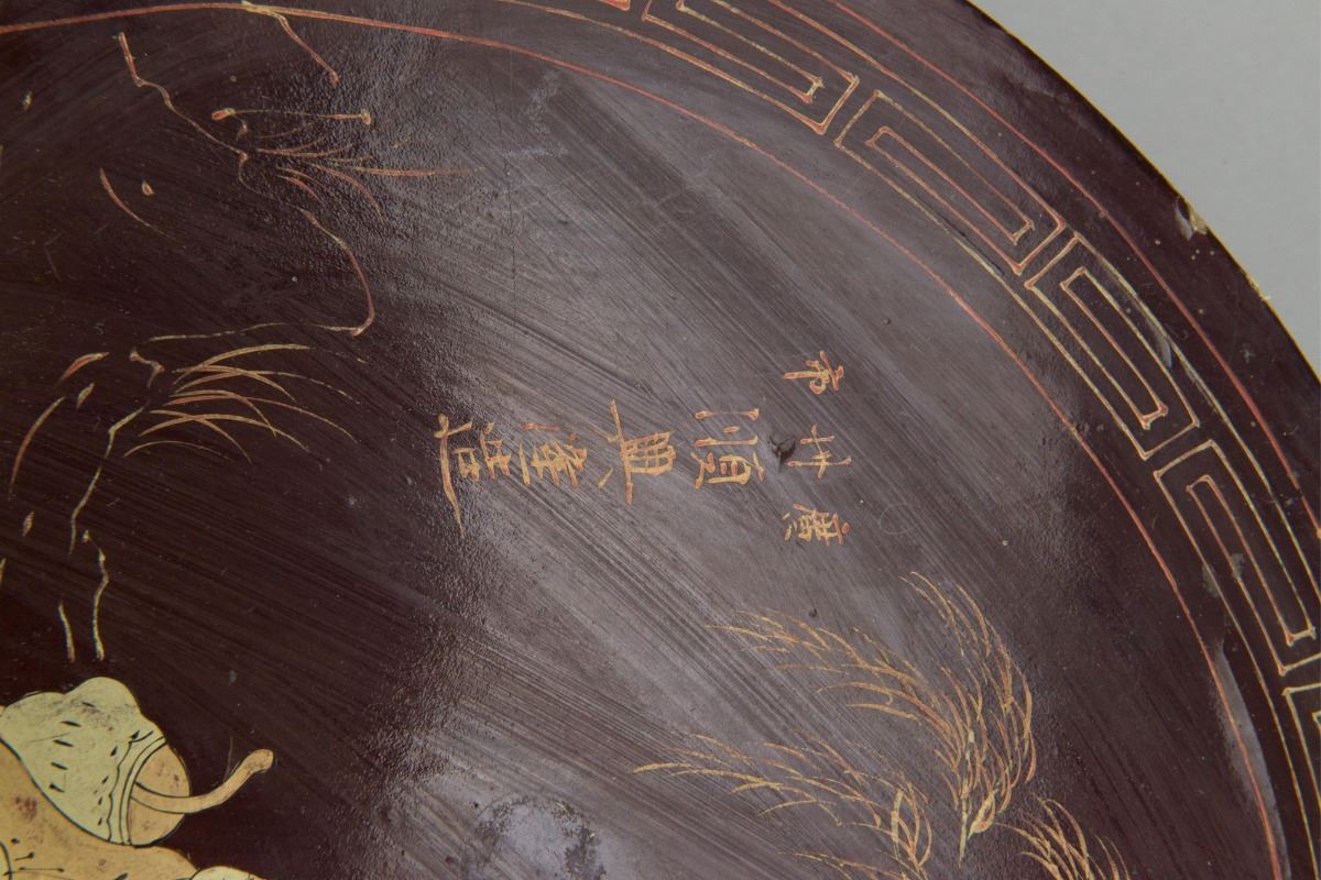 Set of seven pieces, Qing Chinese Canton enamel dishes, dishes painted court scene, base marked CHINA, resting in lacquer box painted resting scholars and marked marker's mark Guang Zhou Shun Xing Long. Notable chip on lacquer box along the rims. H: 9 cm, D: 32.5 cm, 1966 grams.
