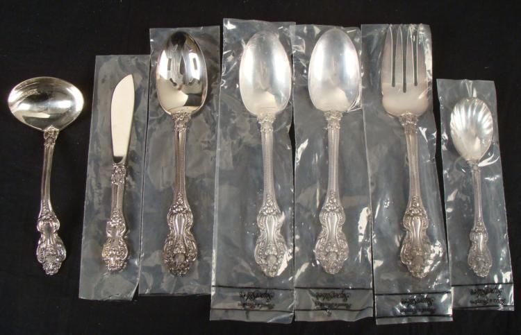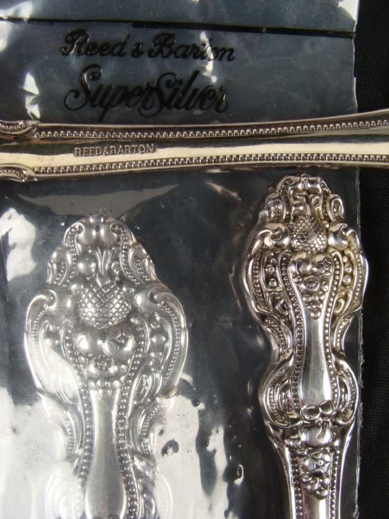 This is a 7 piece set of serving ware from Reed & Barton. The pattern is King Francis, which has a plume and beaded design, and a pineapple at the top, in recognition of the king's favorite fruit. Four pieces are still sealed in the original plastic sleeves, and the others are in near mint condition. * Included are: * 6 5/8" ladle8 3/8" spoon (x2)8 3/8" slotted spoon7" knife6 1/8" spoon