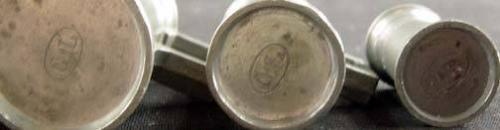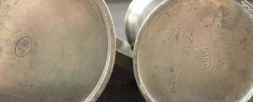 7 Pewter Measurer Tankards, French, 3 marked "JR", 3 marked "CL", 1 marked "LD", 1 liter - 10 centiliters, purchased at the Swiss market in Paris 1958