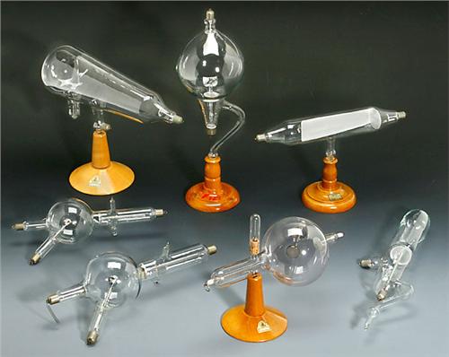 7 Physical Demonstration Valves 1) 3 x-ray tubes, 1 on wooden base, Ø up to 4 1/3 in., 1 tube with minor damages. - And: 2) 4 Crookes' tubes, 3 on wooden bases, good condition.<Br>